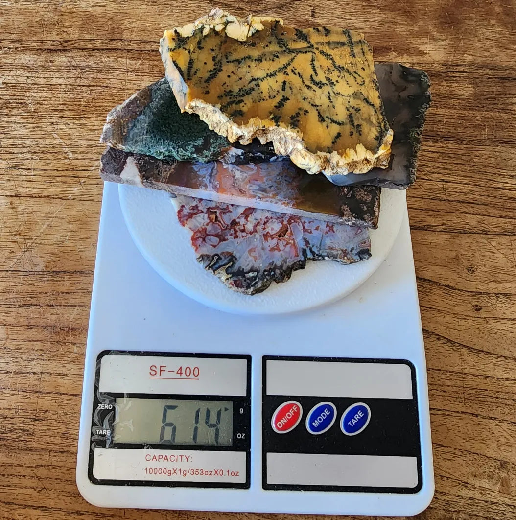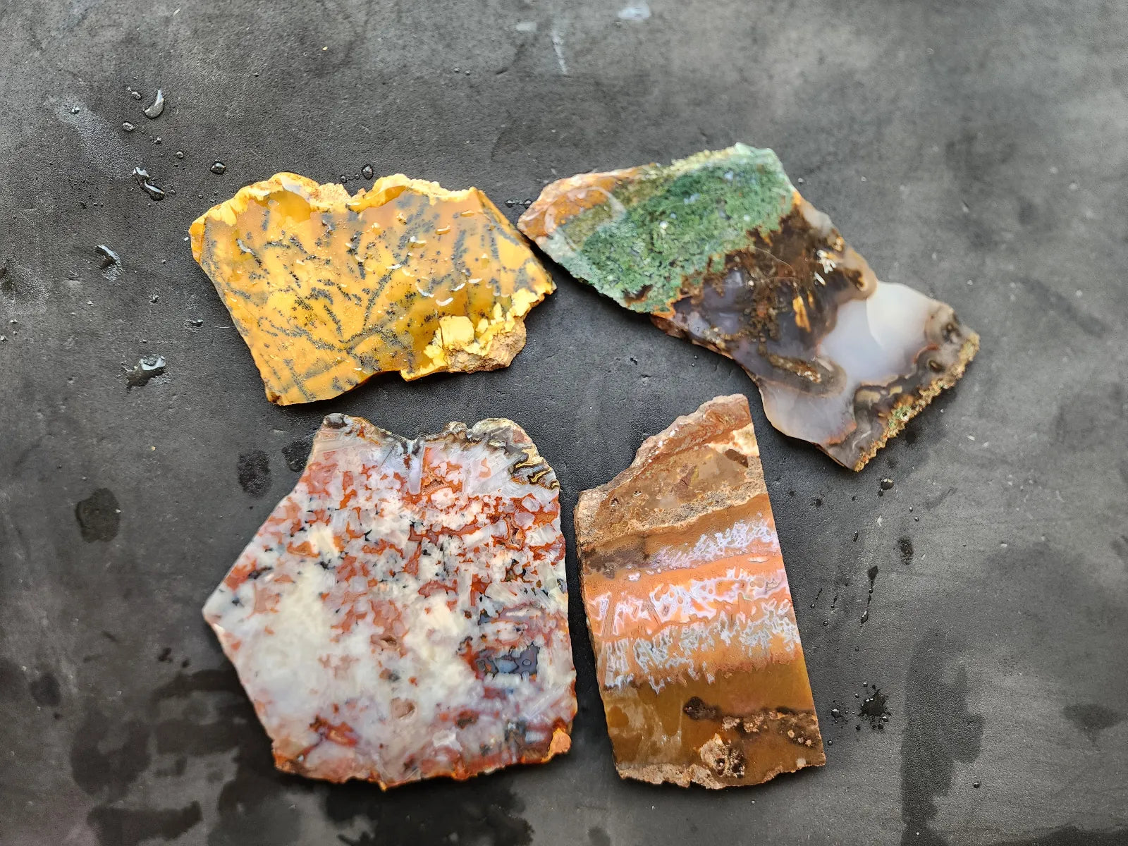 This listing is for four unpolished, undyed, 100% natural top-shelf lapidary slabs from Turkey. Three are agates, one is opal (the yellow one). This agate slice lot weighs a total of 21.65 oz (614 gr). The first 18 pictures and video were taken outdoors, with the slabs wet (not under direct sunlight). The weight and dimension photos were taken indoors, with the rocks dry. We did not apply any filters to the photos or video before or after taking them.