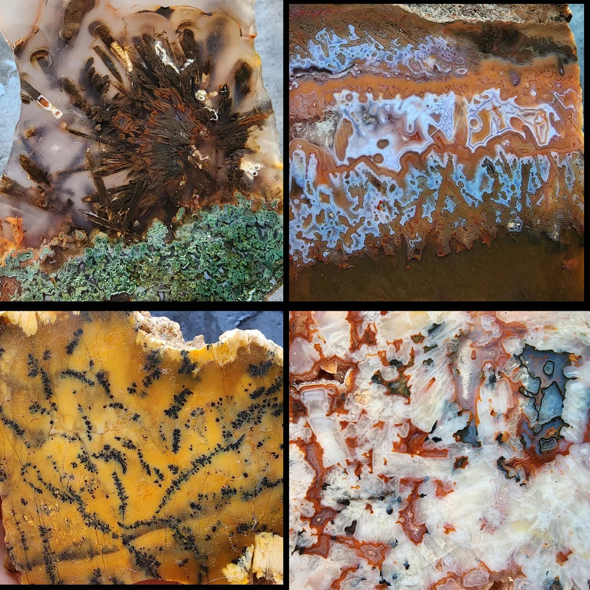 There are a total of four slabs. They are perfect for cabbing and will turn some exceptionally nice -- and pricey -- cabochons once cut and polished (you could polish them directly, as well, without cutting). This lapidary lot has serious potential for the right lapidary artist or rock collector. You can also use them very handsomely in terms of home accents; they will serve as wonderful home decor objects if you polish them and give them proper lighting.