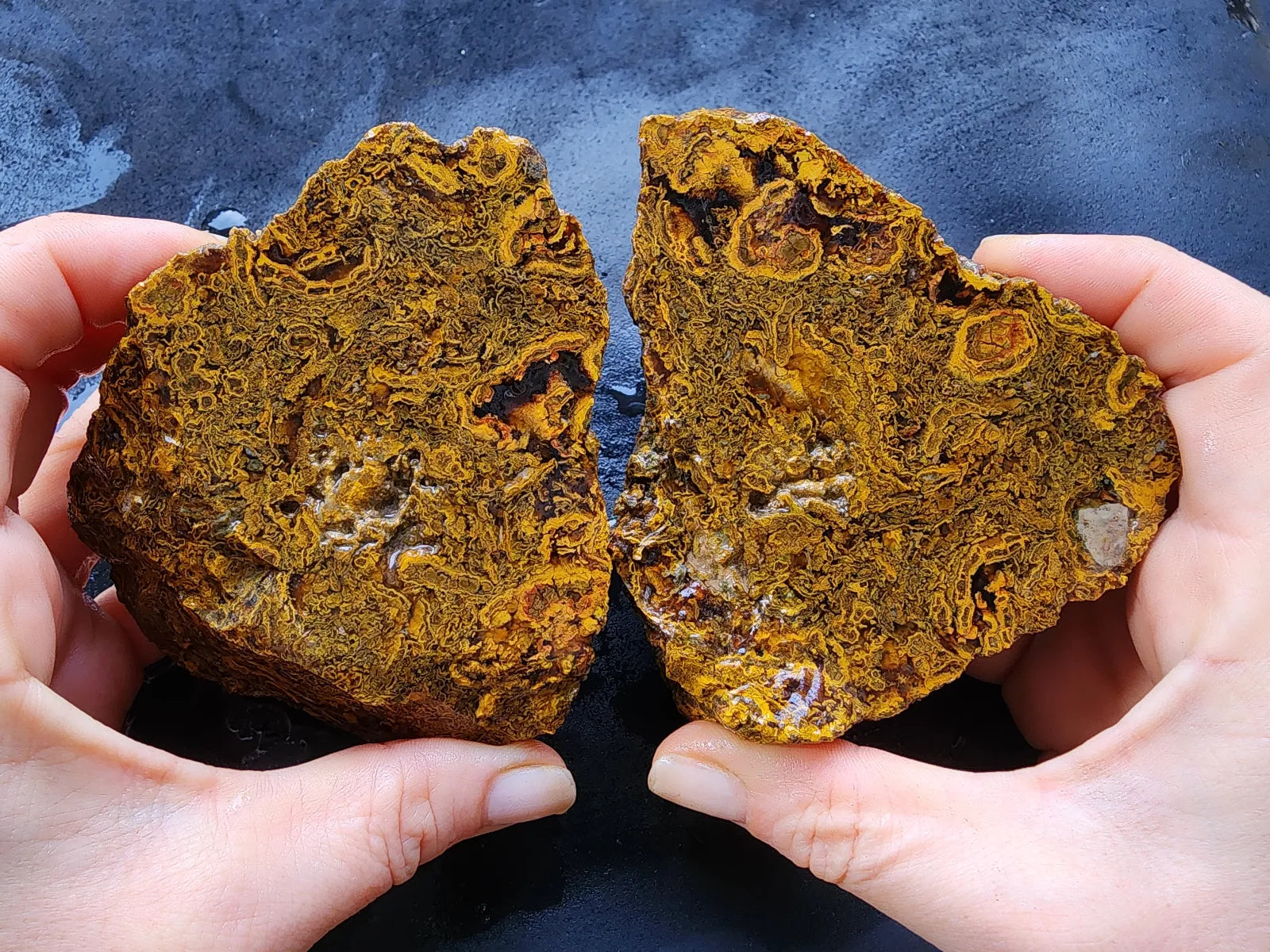 This listing is for an unpolished, undyed, 100% natural lapidary agate rough pair from Turkey weighing a total of 2.2 lbs (1.02 kg). The first 15 pictures and video were taken outdoors with the Turkish agate wet (not under direct sunlight); the rest, indoors and dry. We did not apply any filters to the photos or video, before or after taking them.