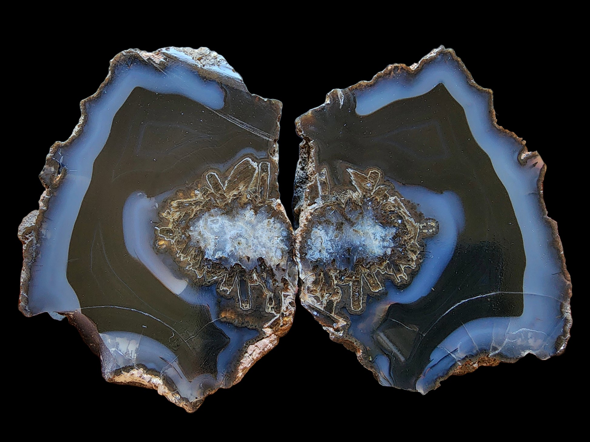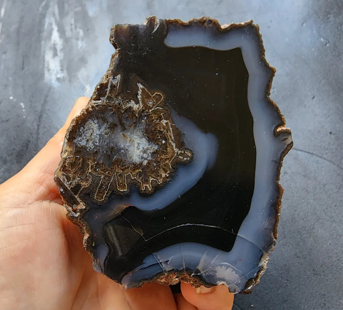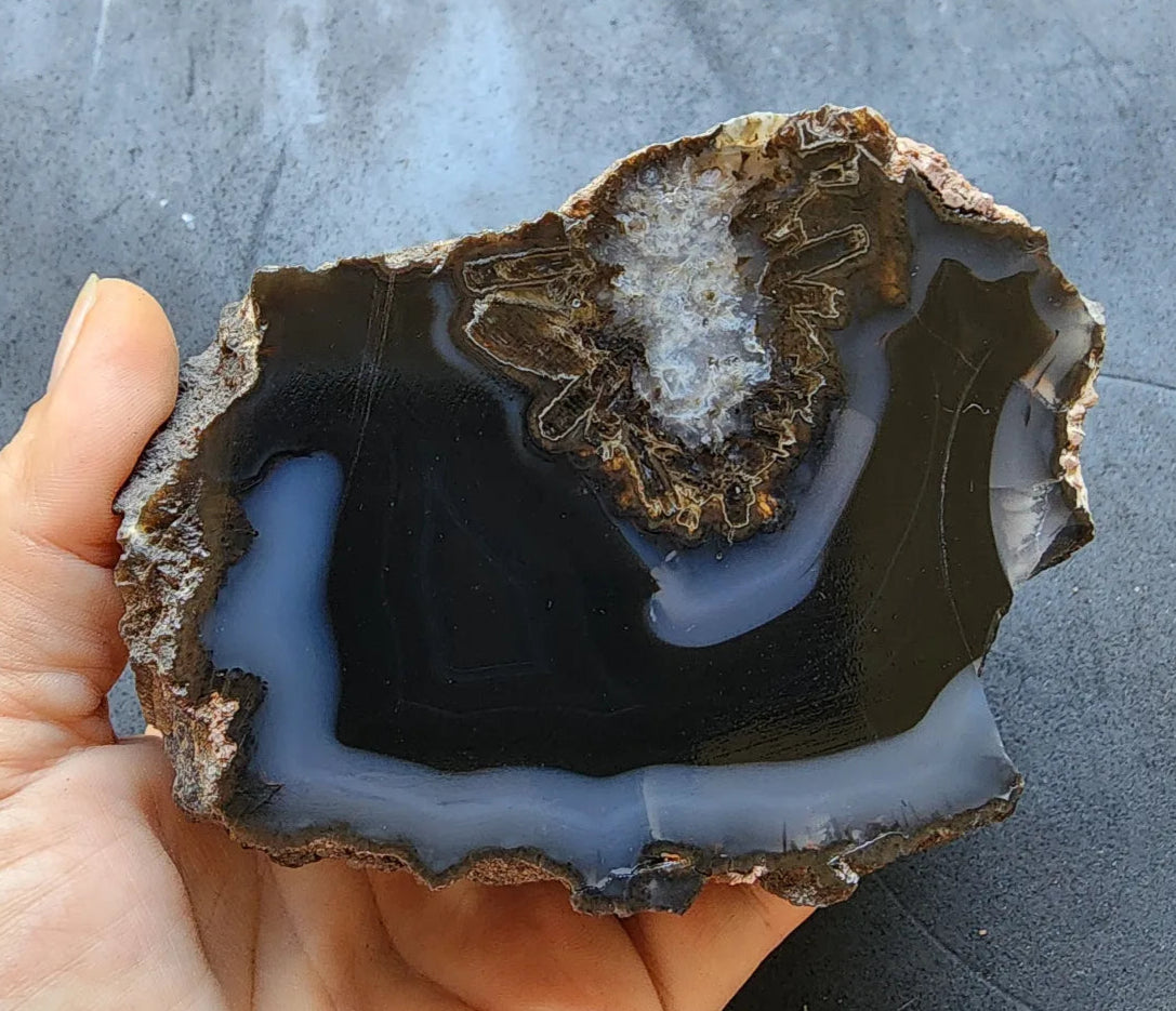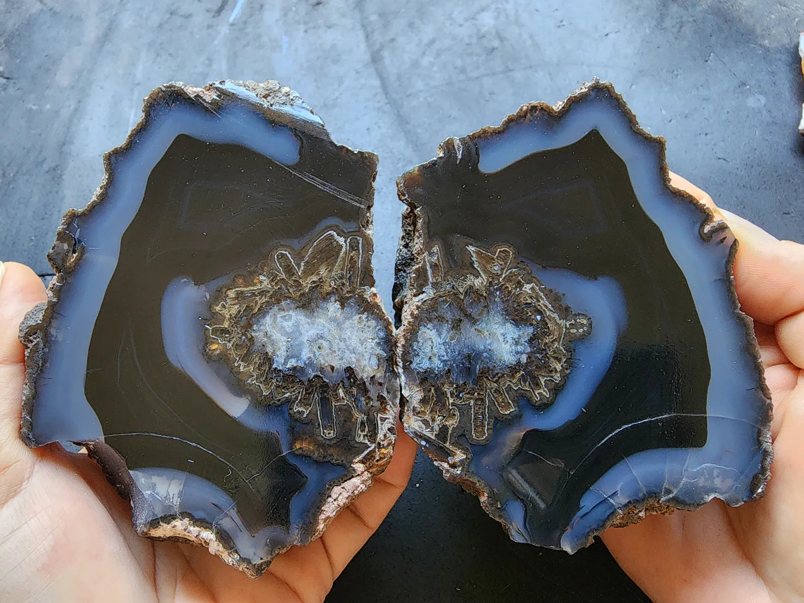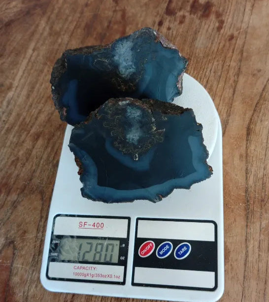 This listing is for an unpolished, undyed, 100% natural light blue black agate from Turkey weighing a total of 2.82 lbs (1.28 kg). The first 10 pictures and video were taken outdoors with the thunder egg pair wet (not under direct sunlight); the rest, indoors and dry. We did not apply any filters to the photos or video, before or after taking them.