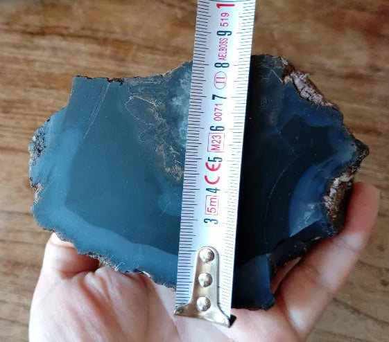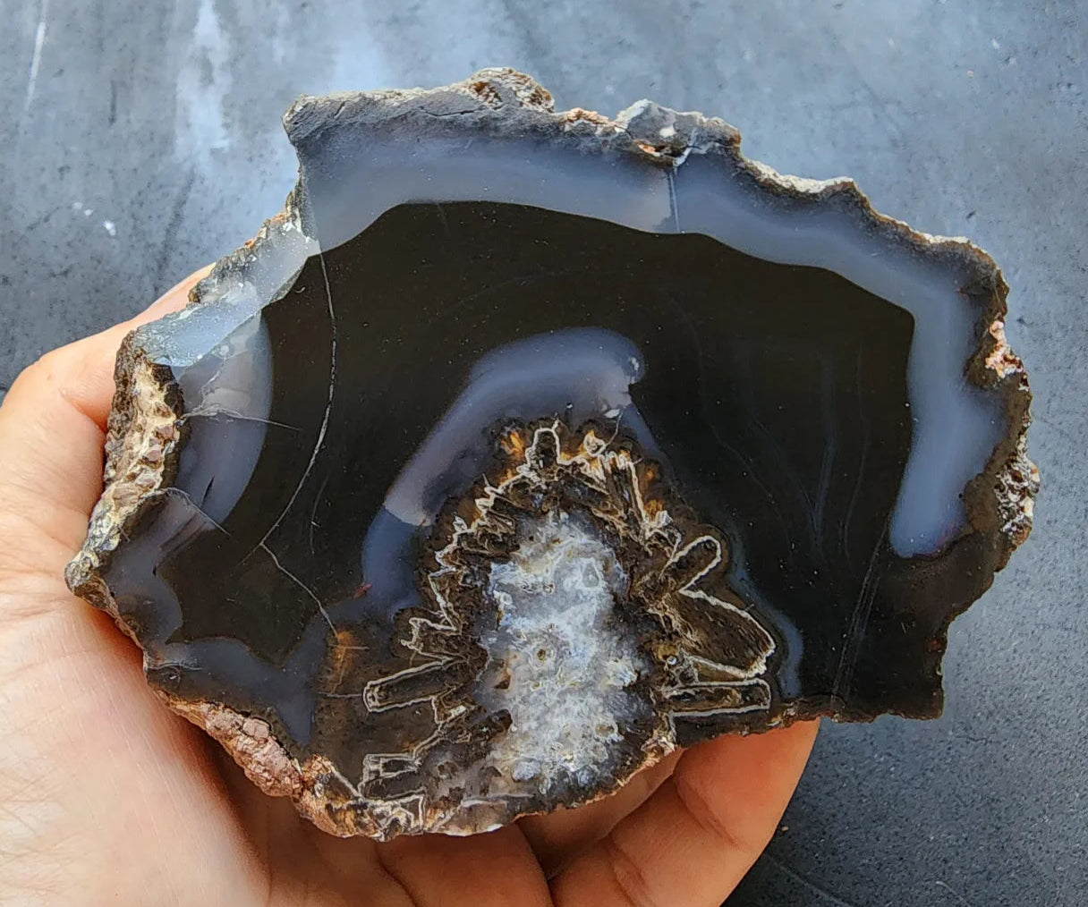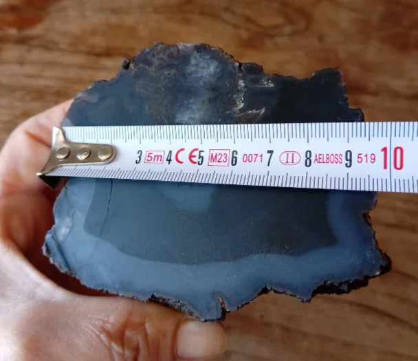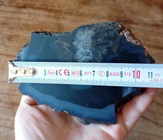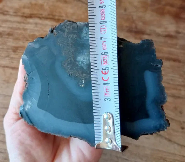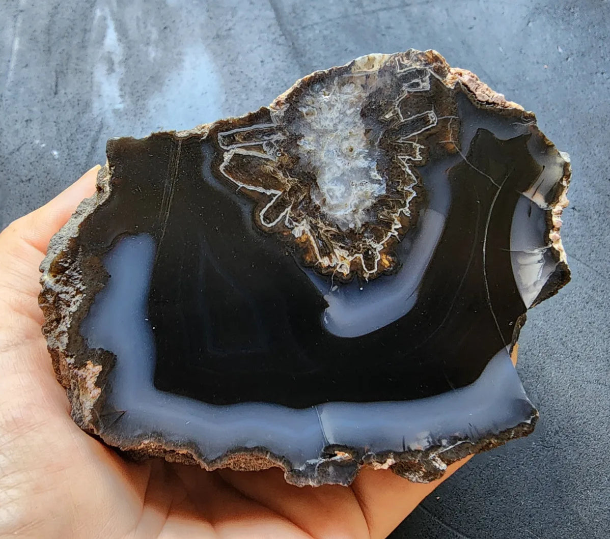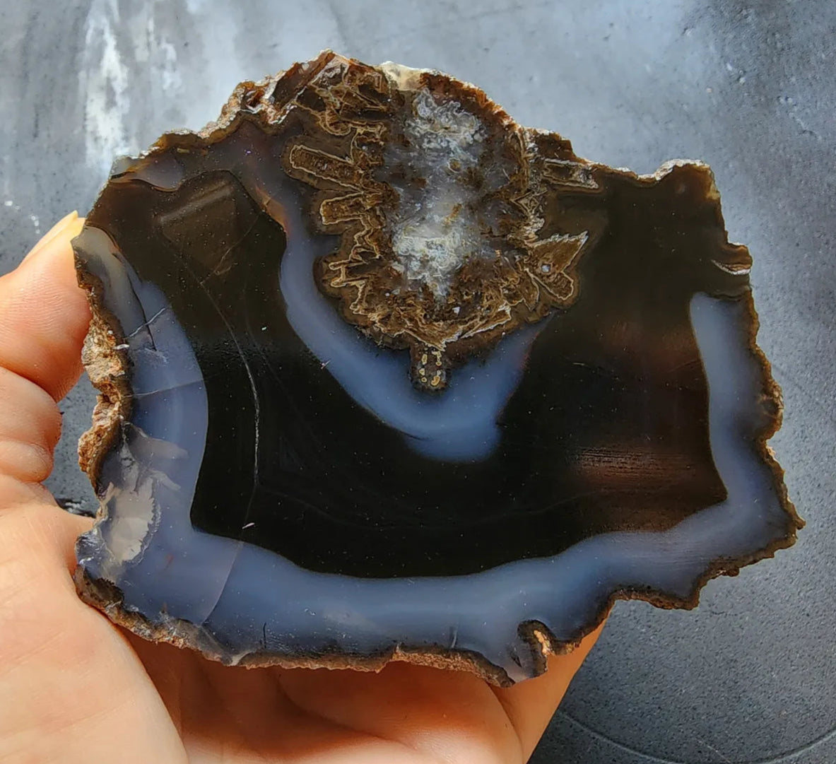 This listing is for an unpolished, undyed, 100% natural light blue black agate from Turkey weighing a total of 2.82 lbs (1.28 kg). The first 10 pictures and video were taken outdoors with the thunder egg pair wet (not under direct sunlight); the rest, indoors and dry. We did not apply any filters to the photos or video, before or after taking them.