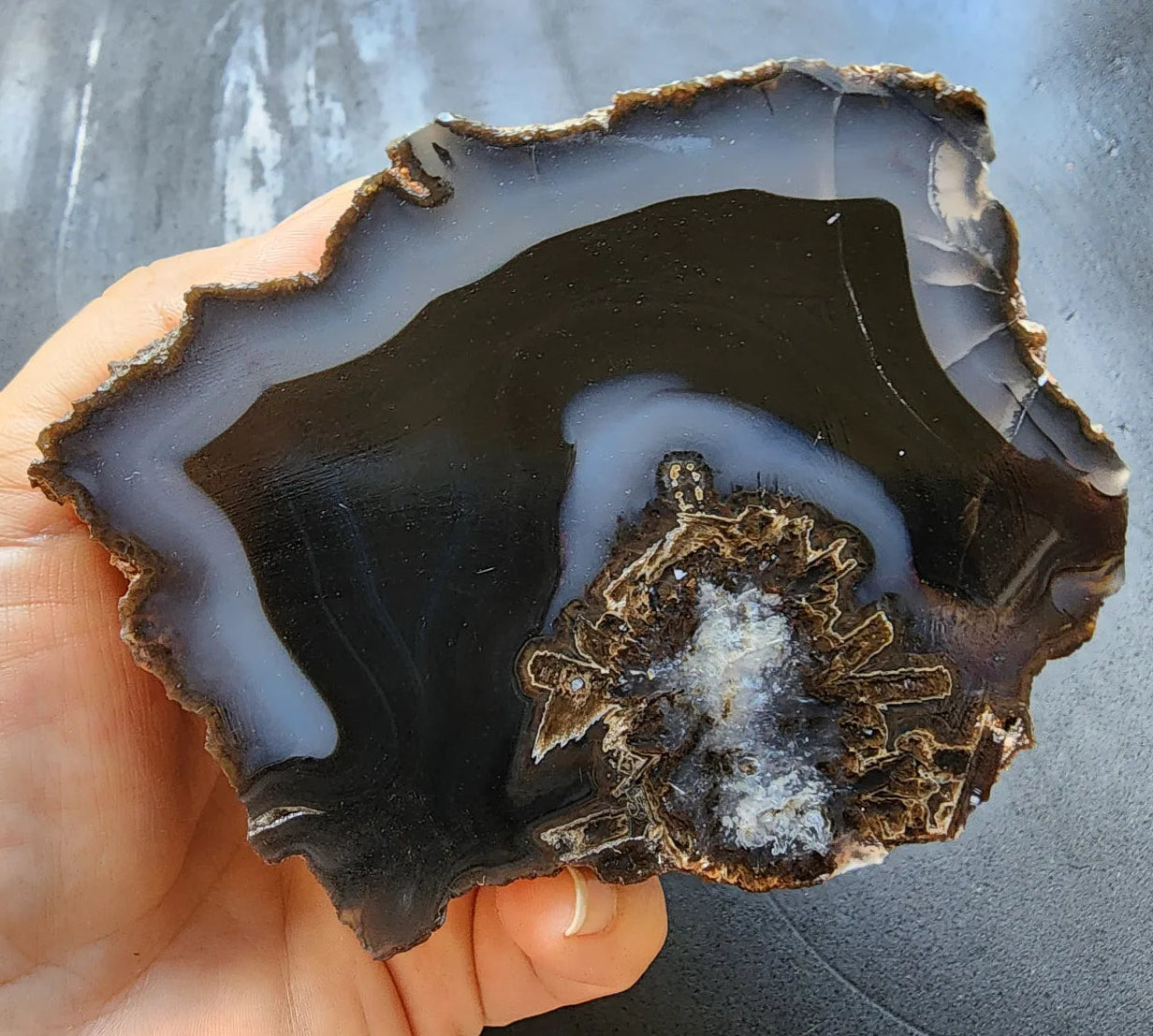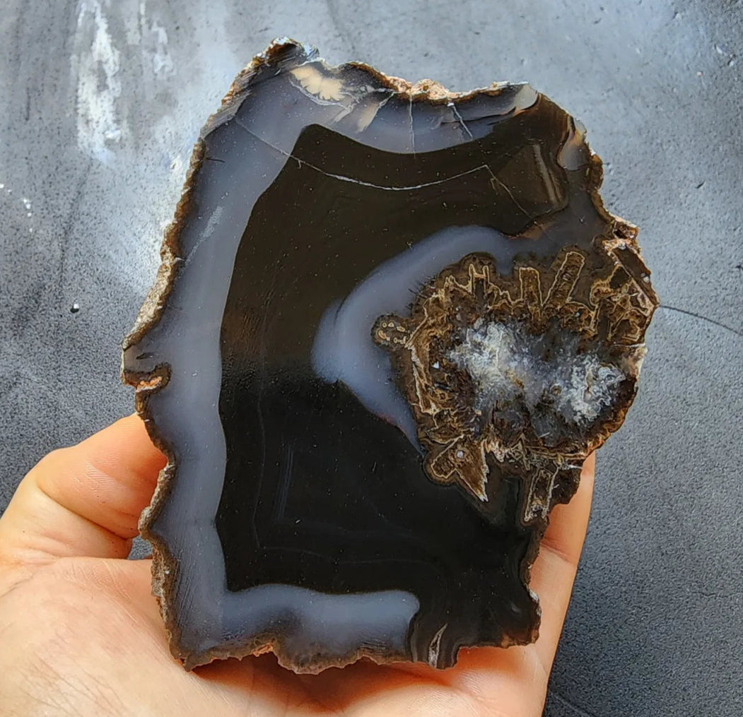This thunder egg is also a healing stone -- it's perfect for chakra alignment, manifestation, and divination if you are spiritually-inclined and interested in metaphysical stones, meditation stones, and spiritual gifts. It's an ideal agate gift, geologist gift or rock hound gift and will display very handsomely as an agate decor piece -- as home decor, office decor, or room decor. It can be displayed as an interior design element in any space.