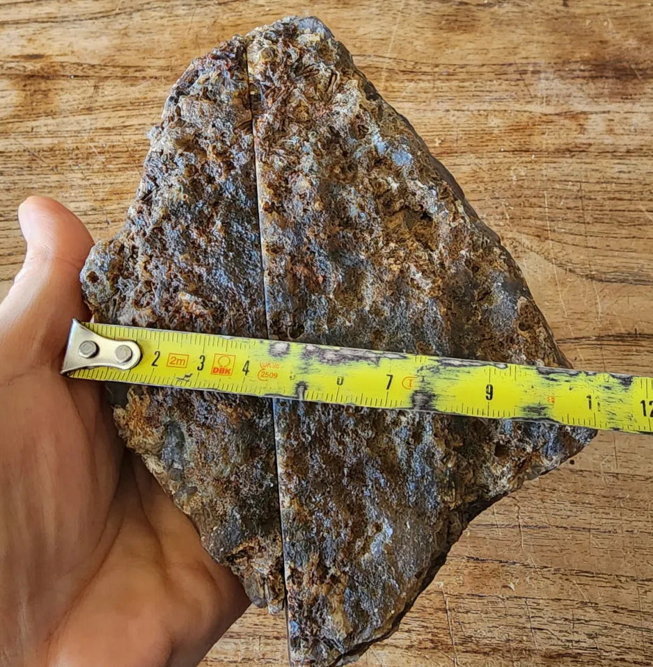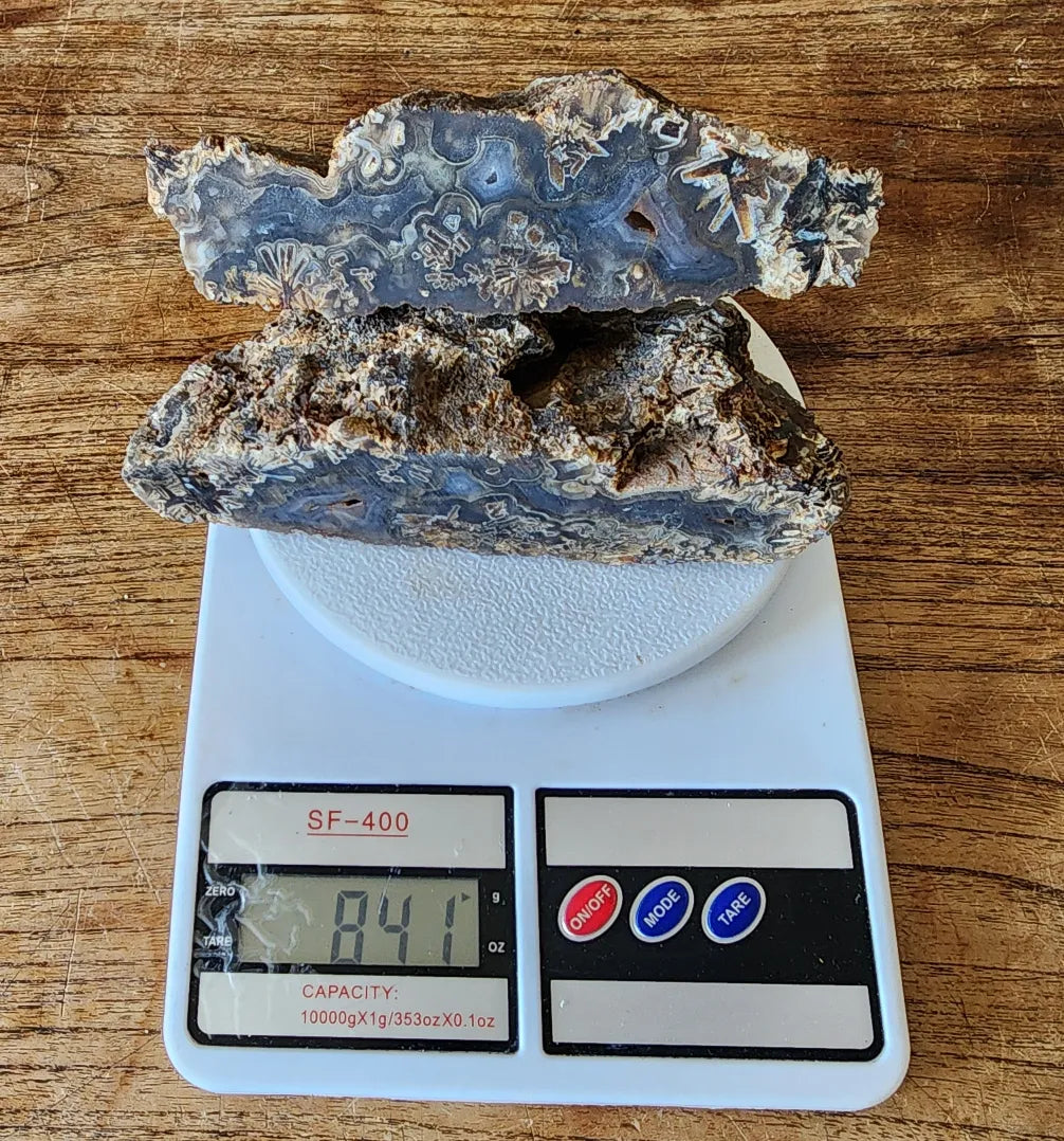 This listing is for an unpolished, undyed, 100% natural bubble agate / blue agate pair from Turkey weighing a total of 29.66 oz (841 gr). The first 11 pictures and video were taken outdoors with the botryoidal agate wet (not under direct sunlight); the rest, indoors and dry. We did not apply any filters to the photos or video, before or after taking them. It will grace any rock collection, any area.