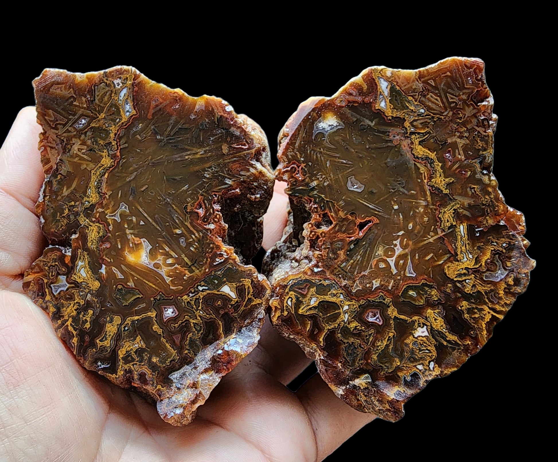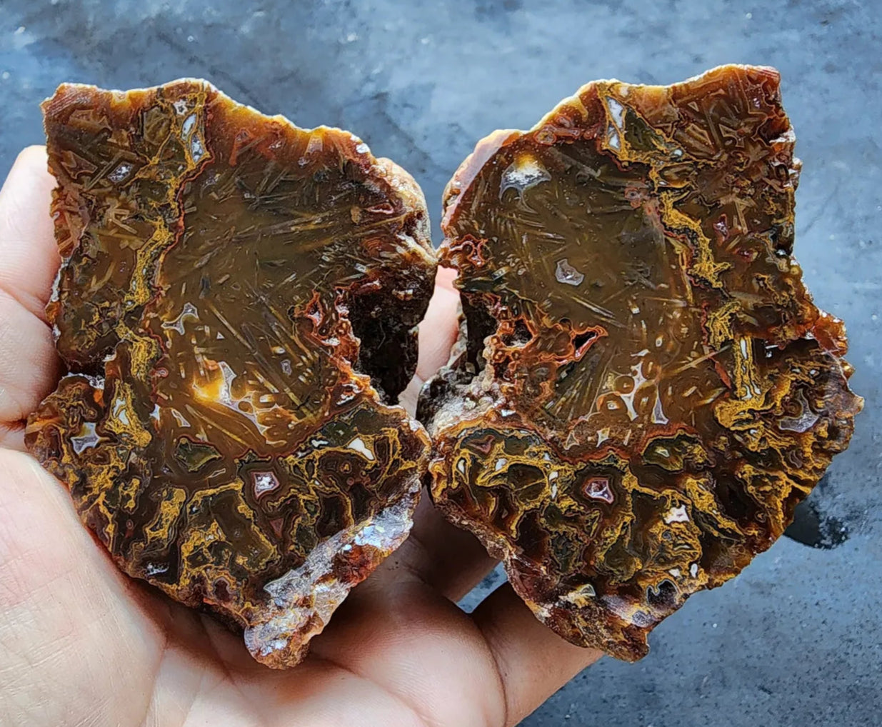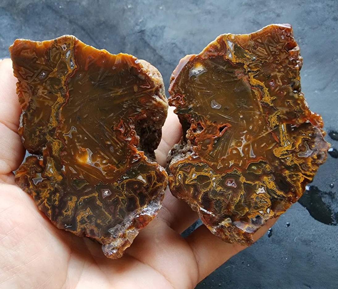 This listing is for an unpolished, undyed, 100% natural carnelian agate / sagenite agate pair from Turkey weighing a total of 16.61 oz (471 gr). The first 10 pictures and video were taken outdoors with the agate wet (not under direct sunlight); the rest, indoors and dry. We did not apply any filters to the photos or video, before or after taking them. They will grace any rock collection.
