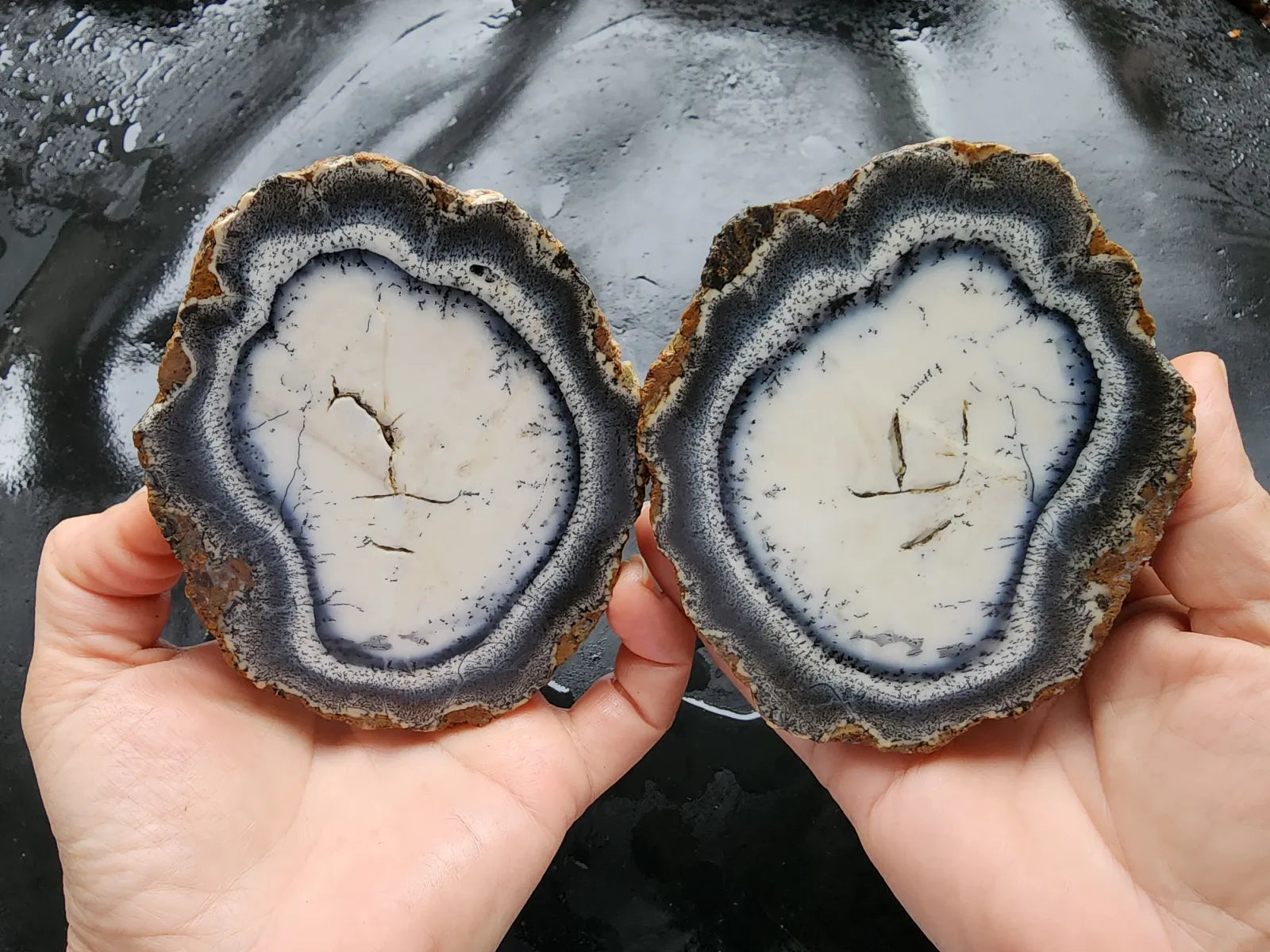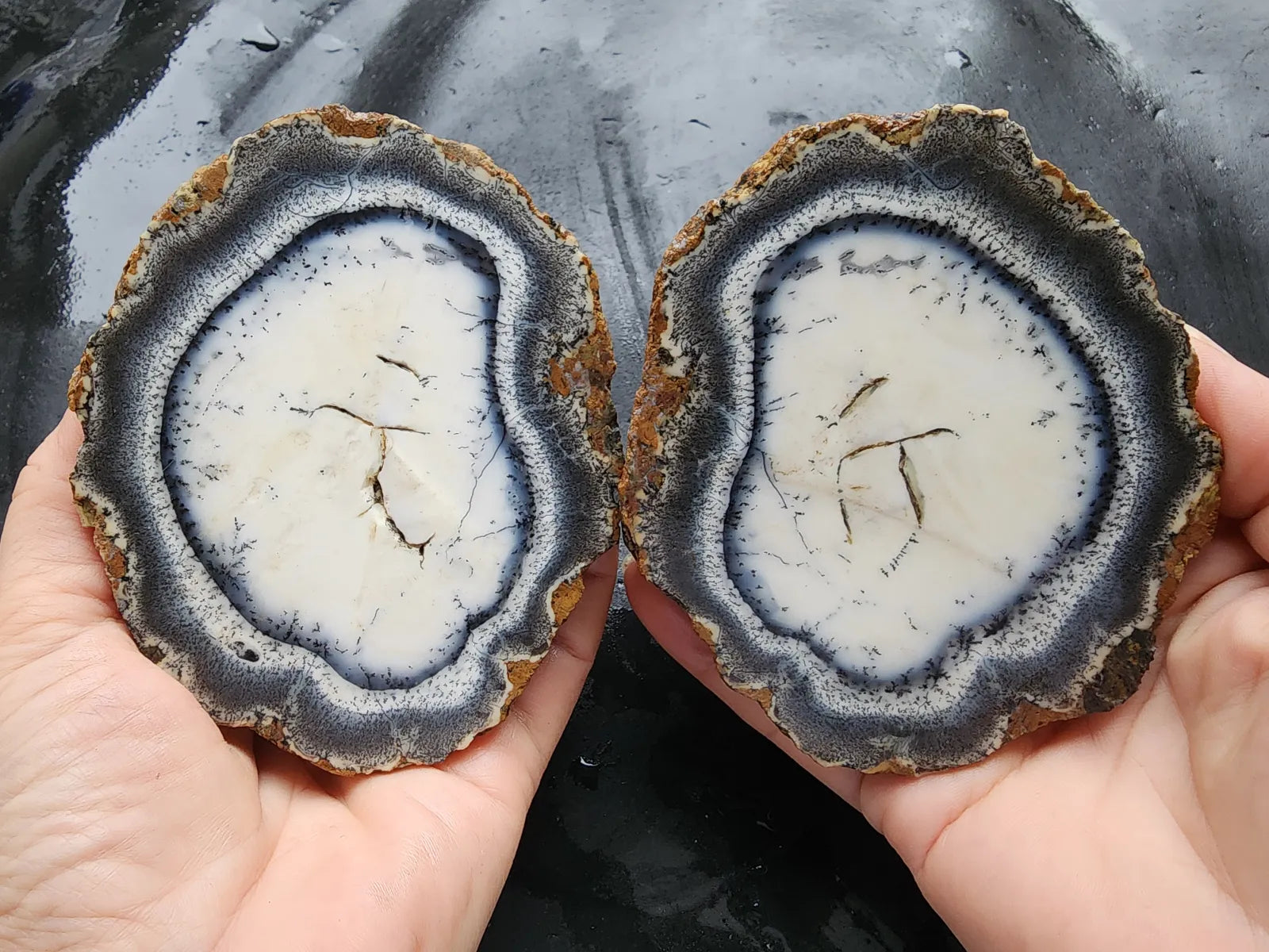 This listing is for an unpolished, undyed, 100% natural dendritic opal pair from Turkey weighing a total of 21.7 oz (618 gr). The first 11 pictures and video were taken outdoors with the dendritic opal rough wet (not under direct sunlight); the rest, indoors and dry. We did not apply any filters to the photos or video, before or after taking them. It will grace any rock collection, any area.