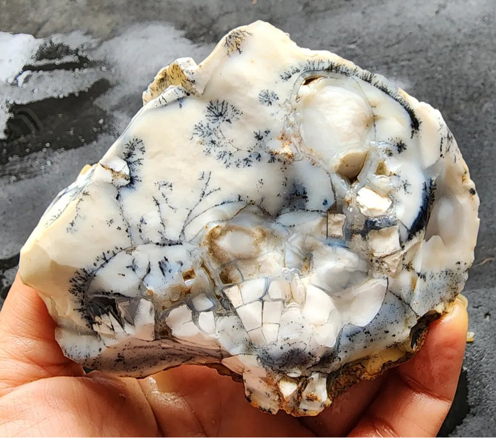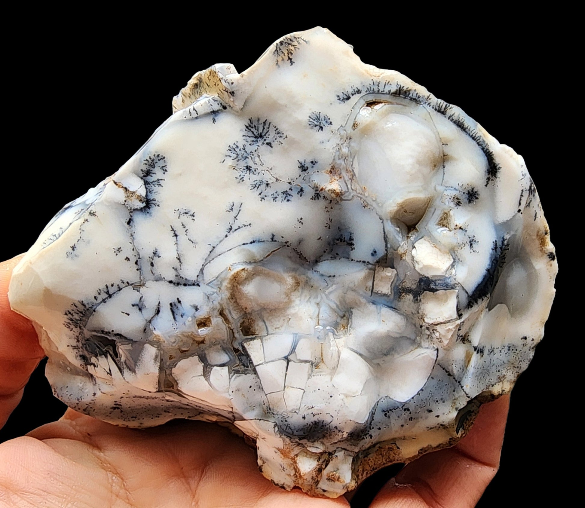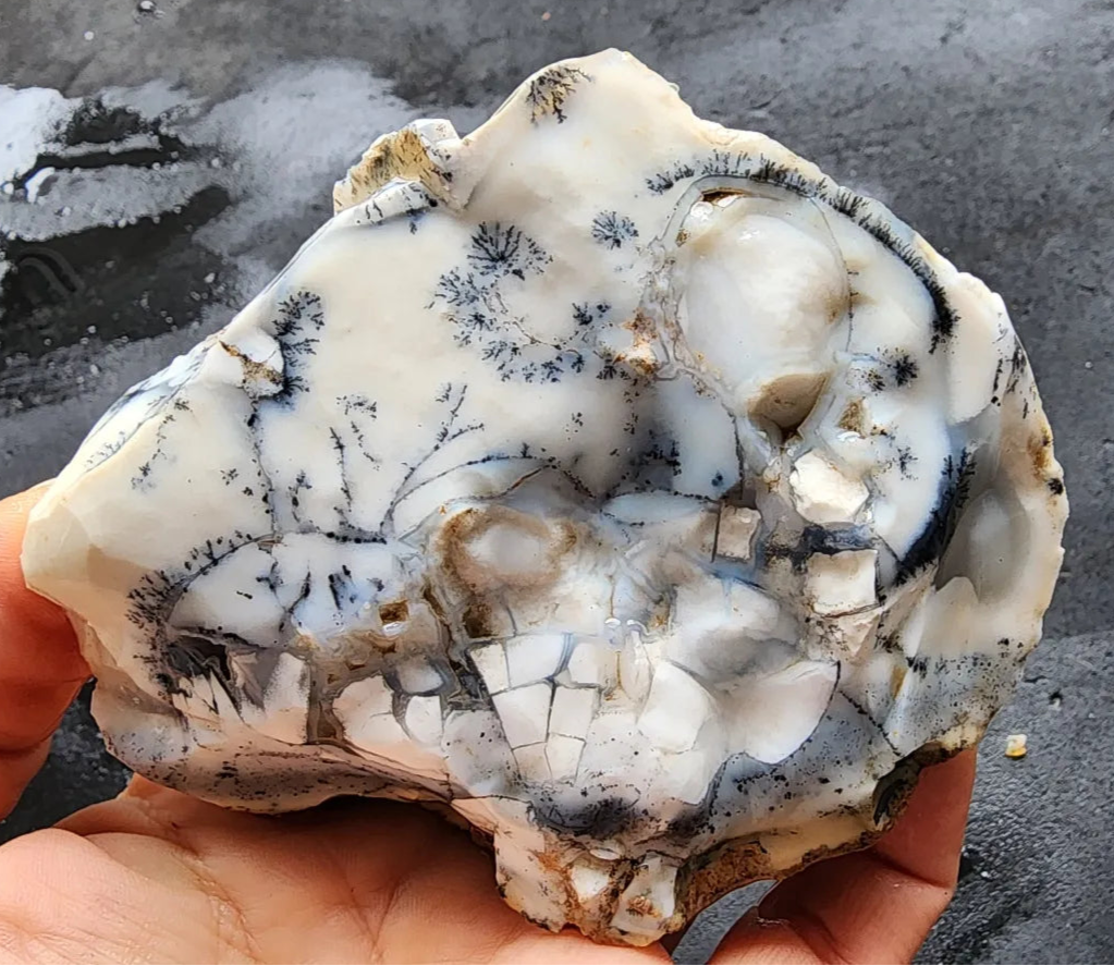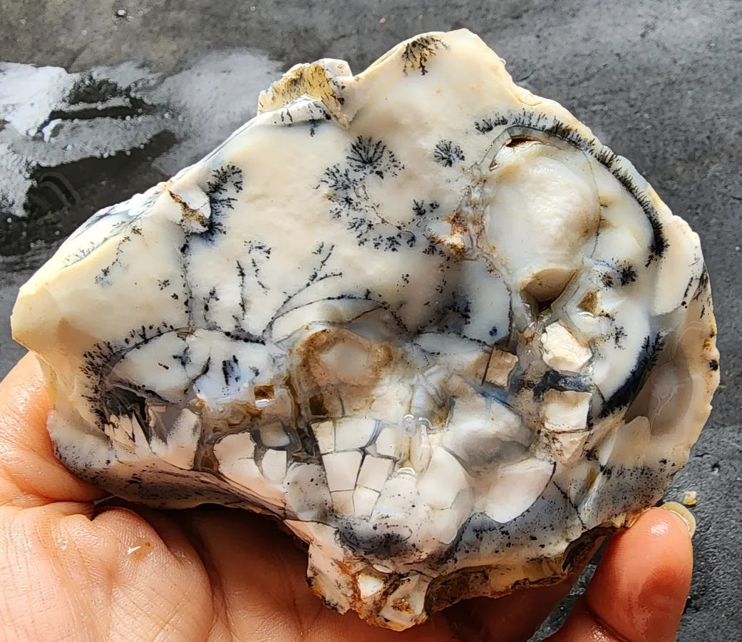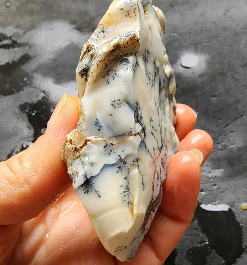 This listing is for an unpolished, undyed, 100% natural dendritic opal rough / dendritic opal slab from Turkey weighing a total of 7.47 oz (212 gr). The first 12 pictures and video were taken outdoors with the dendrite opal rough wet (not under direct sunlight); the rest, indoors and dry. We did not apply any filters to the photos or video, before or after taking them.