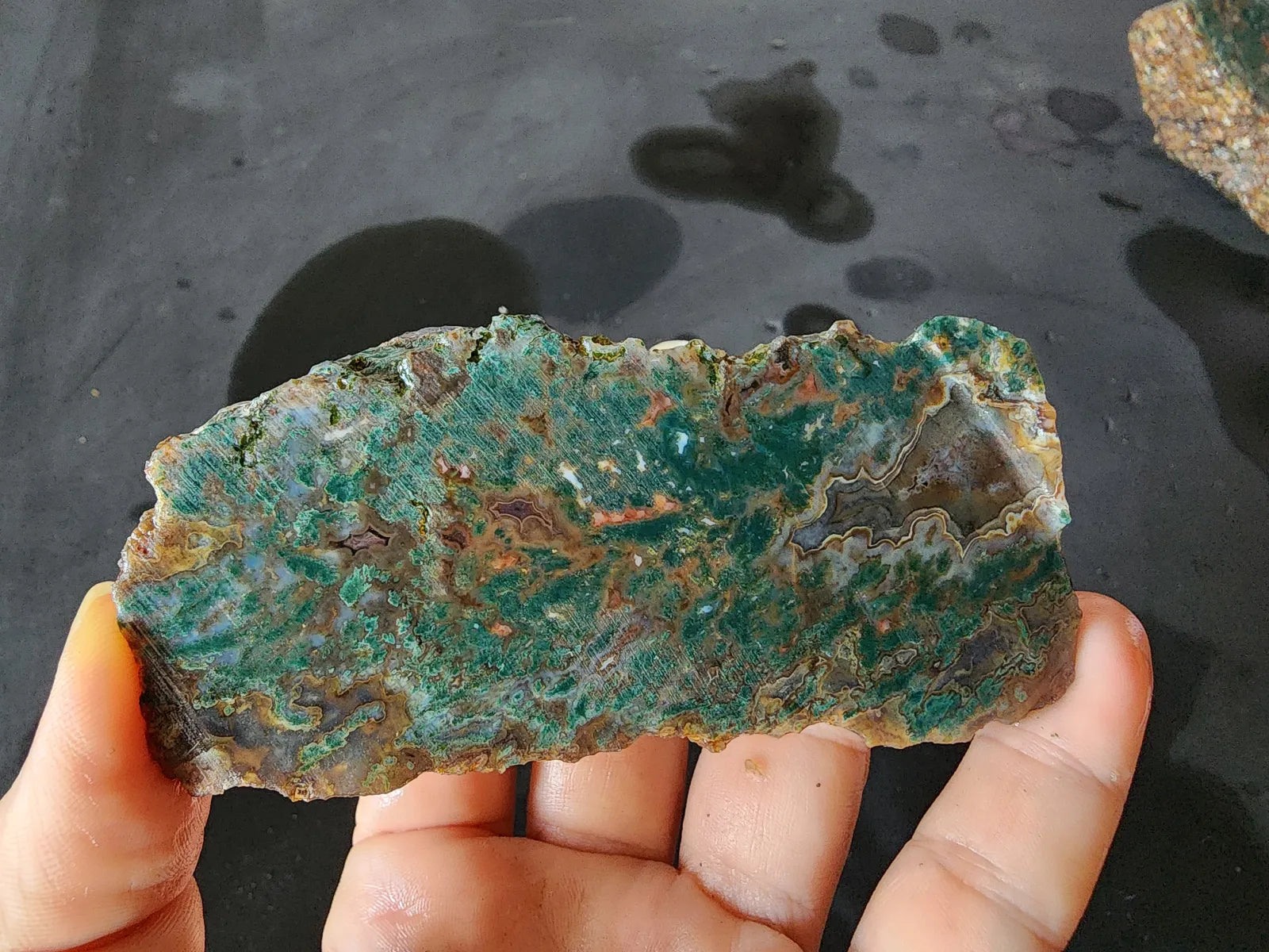 This listing is for an unpolished, undyed, 100% natural agatized jasper / jasper agate pair from Turkey weighing a total of 18.83 oz (534 gr). The first nine pictures and video were taken outdoors with the green agate wet (not under direct sunlight); the rest, indoors and dry. We did not apply any filters to the photos or video, before or after taking them. It will grace any rock cabinet, any rock collection, not to mention turn out some seriously sweet cabs.