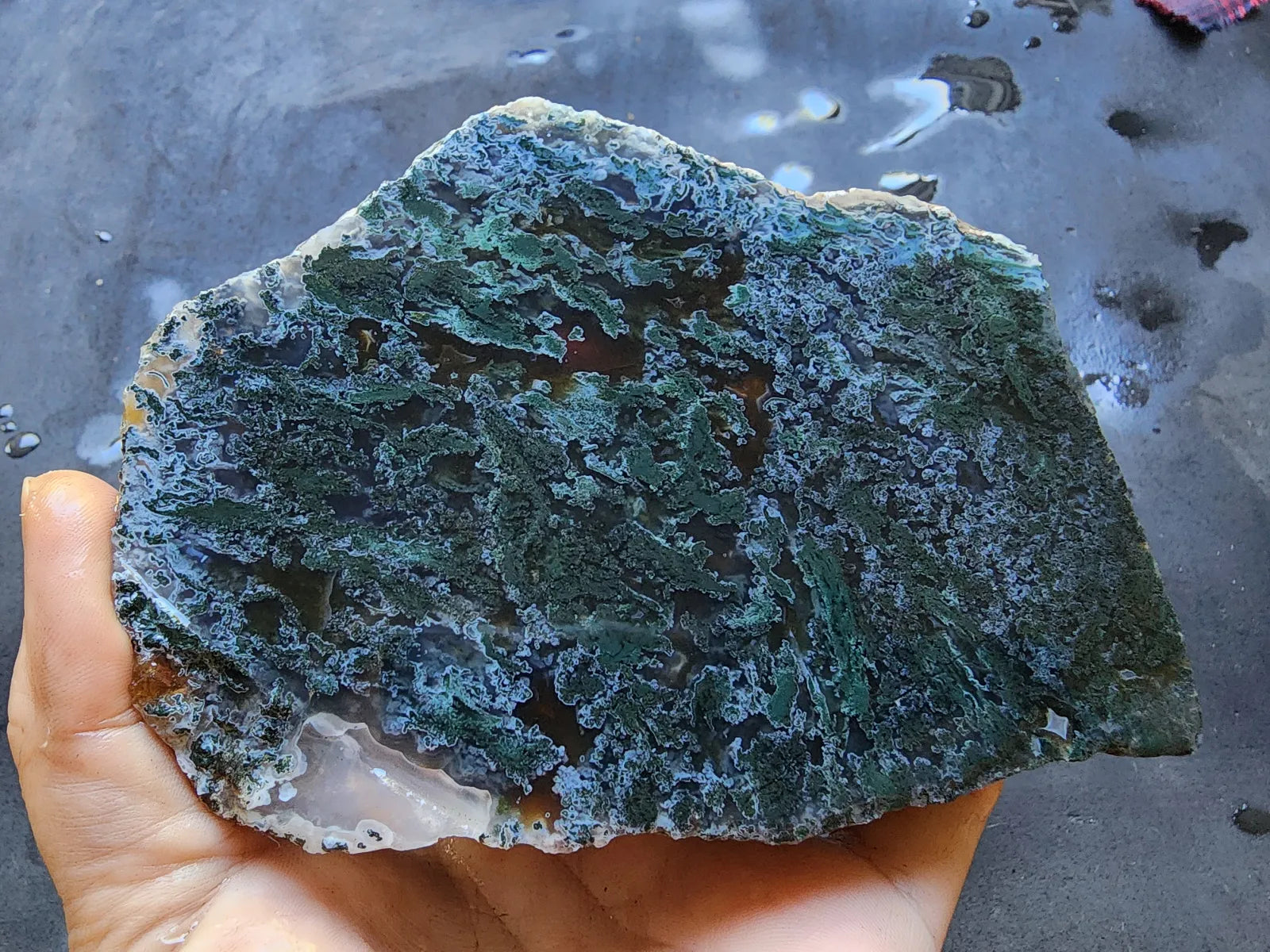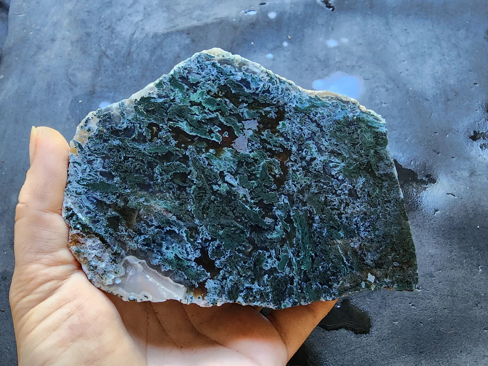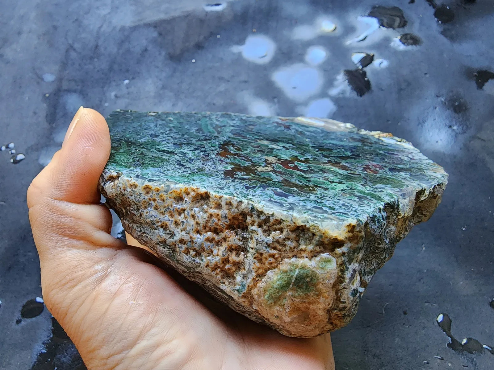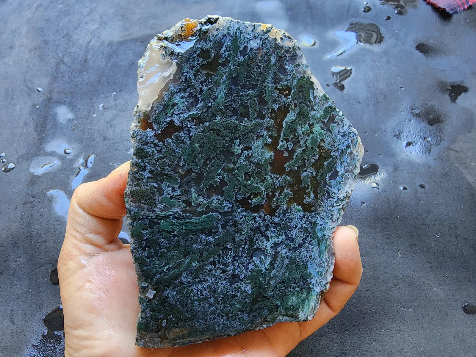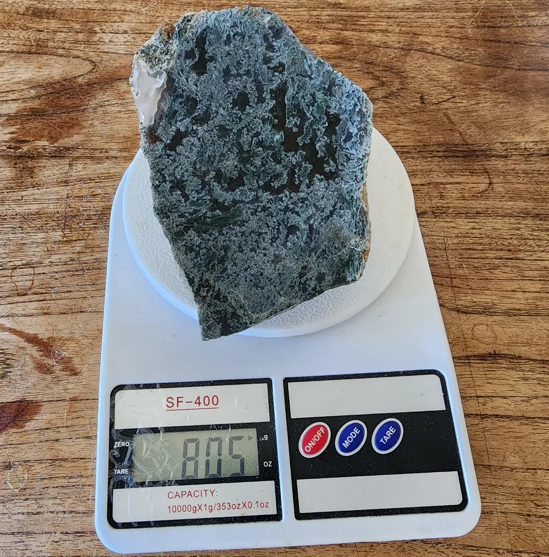 This listing is for an unpolished, undyed, 100% natural green moss agate slab from Turkey weighing a total of 28.39 oz (805 gr). The first 11 pictures and video were taken outdoors with the green moss agate rough wet (not under direct sunlight); the rest, indoors and dry. We did not apply any filters to the photos or video, before or after taking them.