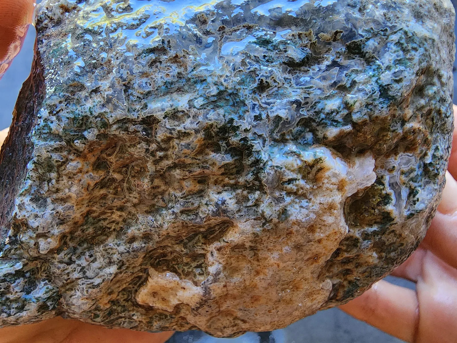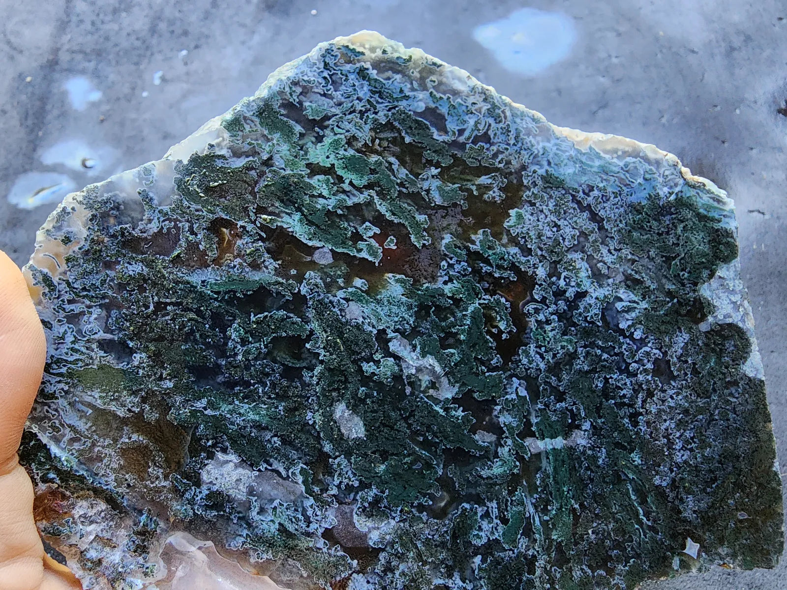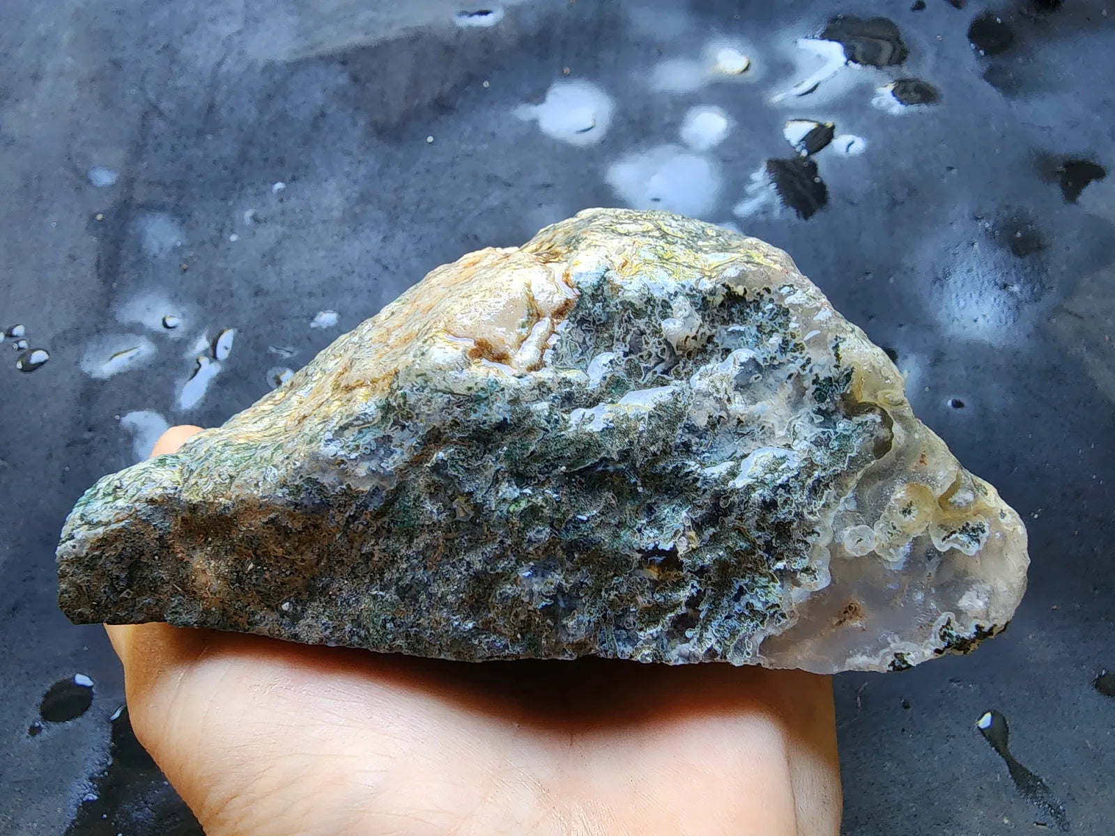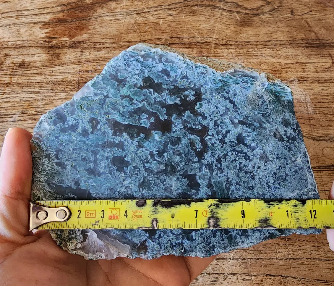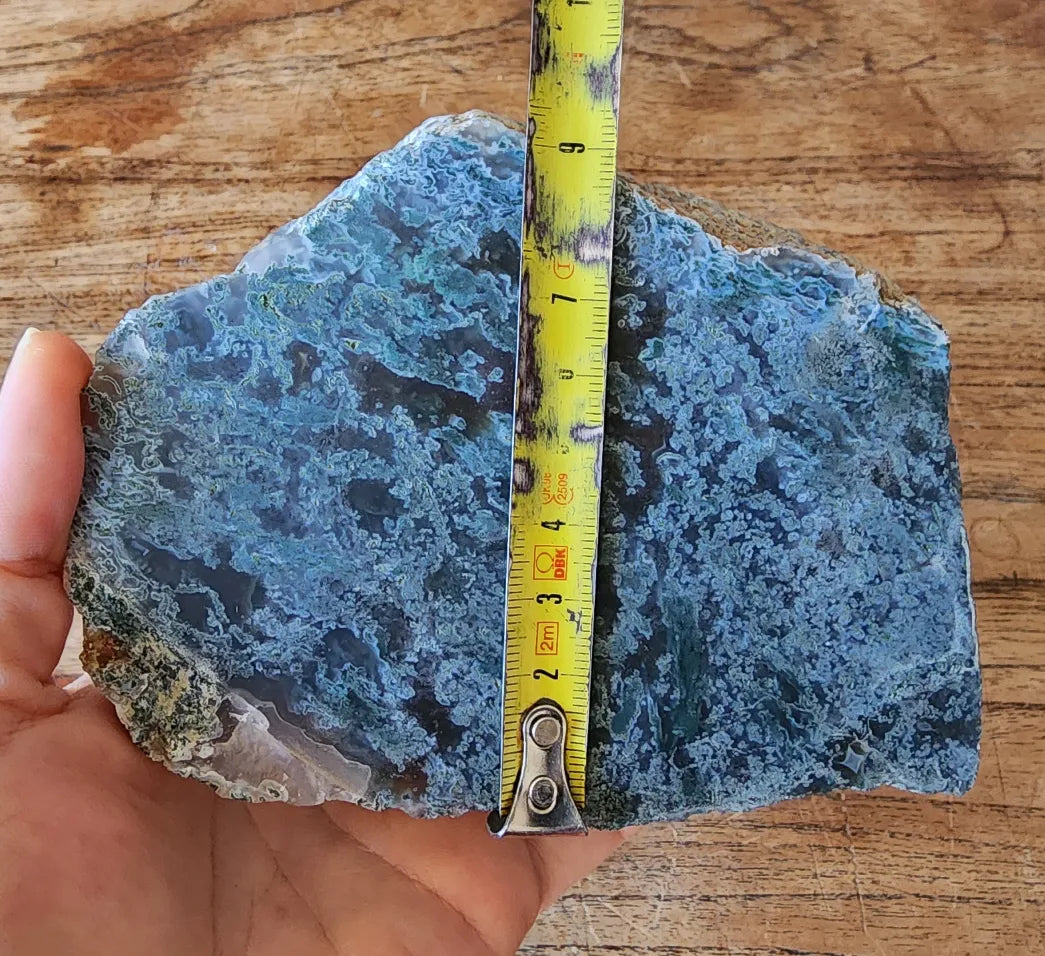 This listing is for an unpolished, undyed, 100% natural green moss agate slab from Turkey weighing a total of 28.39 oz (805 gr). The first 11 pictures and video were taken outdoors with the green moss agate rough wet (not under direct sunlight); the rest, indoors and dry. We did not apply any filters to the photos or video, before or after taking them.