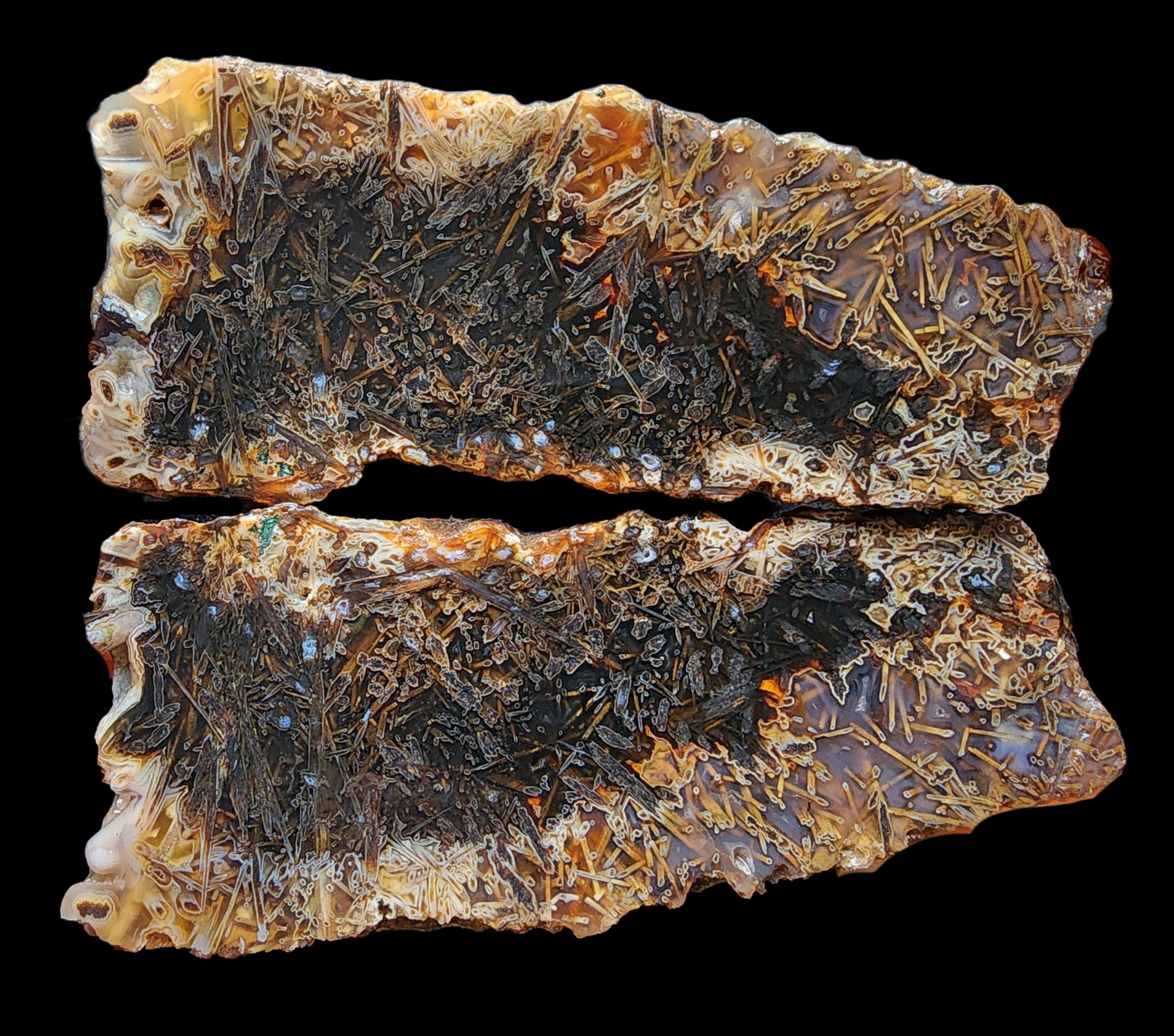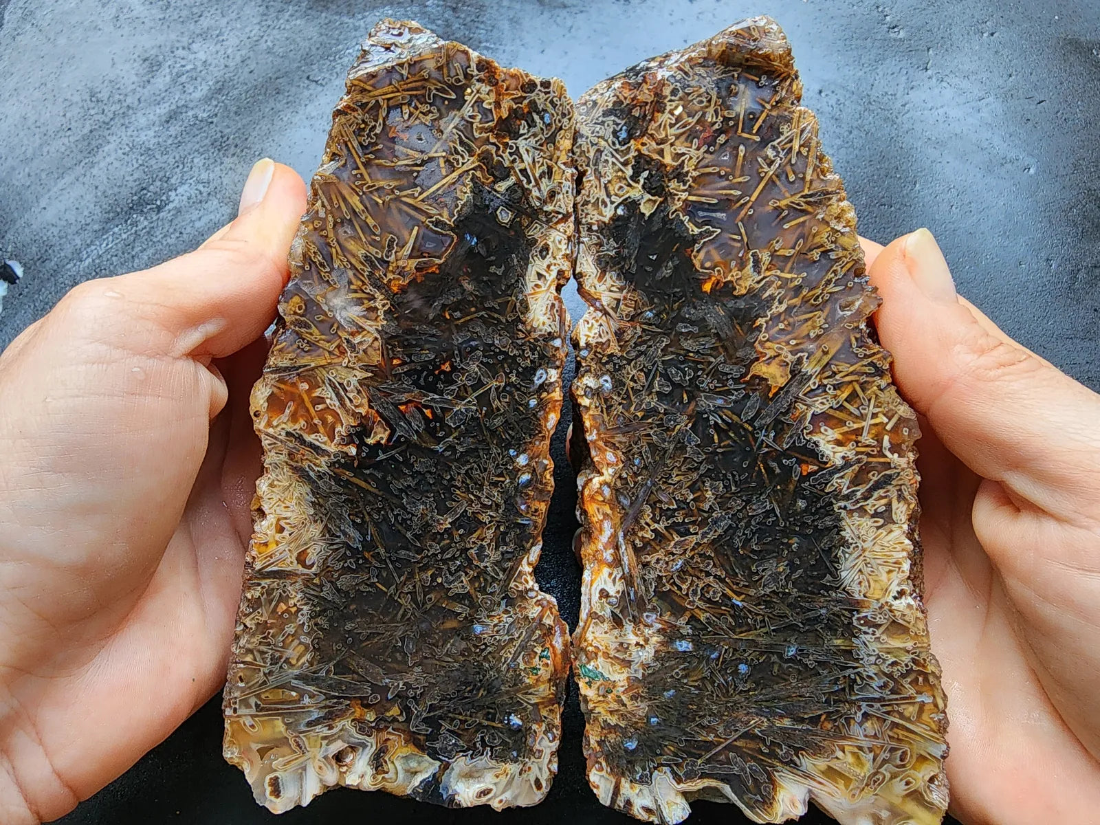 This listing is for an unpolished, undyed, 100% natural pseudomorph agate pair from Turkey weighing a total of 34.95 oz (991 gr). The first 12 pictures and video were taken outdoors with the needle agate pair wet (not under direct sunlight); the rest, indoors and dry. We did not apply any filters to the photos or video, before or after taking them. They will grace any rock cabinet, any rock collection.
