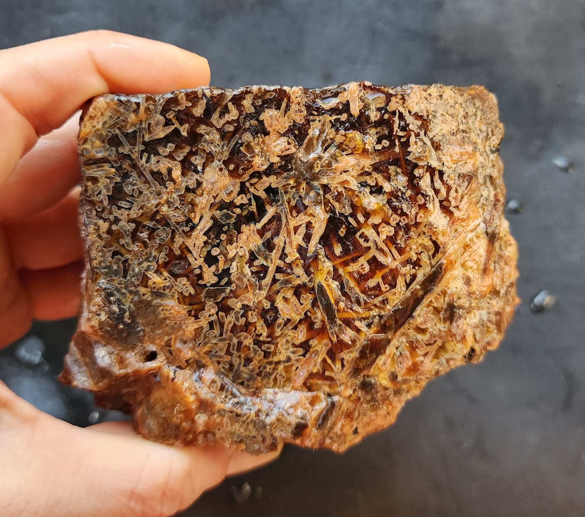 This listing is for an unpolished, undyed, 100% natural Turkish agate that weighs a total of 16.96 oz (481 gr). The first nine pictures and video were taken outdoors with the needle agate wet (not under direct sunlight); the rest, indoors and dry. We did not apply any filters to the photos or video, before or after taking them. They're guaranteed to stand out in any rock cabinet, any rock collection.