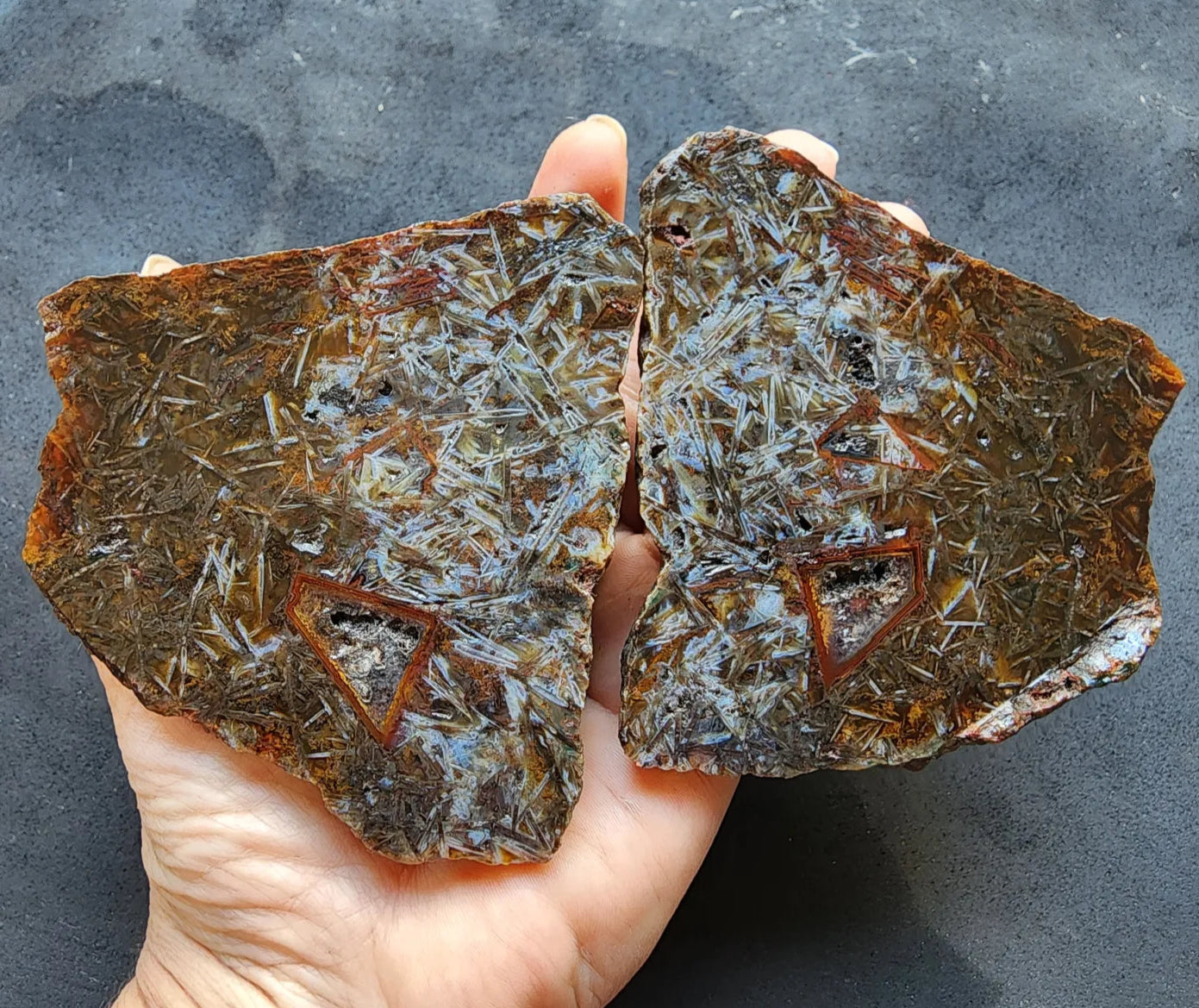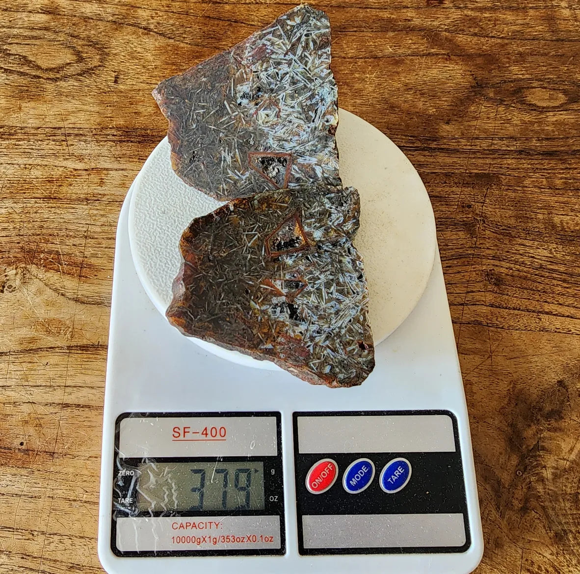 This listing is for an unpolished, undyed, 100% natural polyhedral agate / needle agate pair from Turkey weighing a total of 13.36 oz (379 gr). The first 12 pictures and video were taken outdoors with the sagenite agate pair wet (not under direct sunlight); the rest, indoors and dry. We did not apply any filters to the photos or video, before or after taking them. They will grace any rock collection.