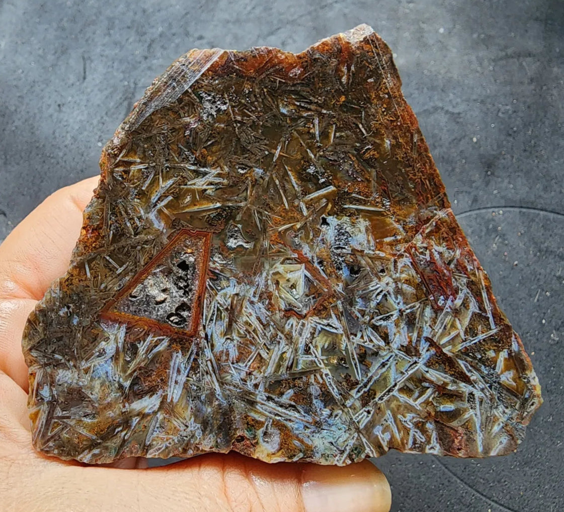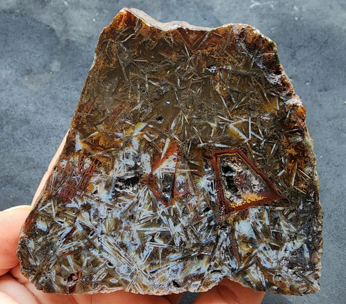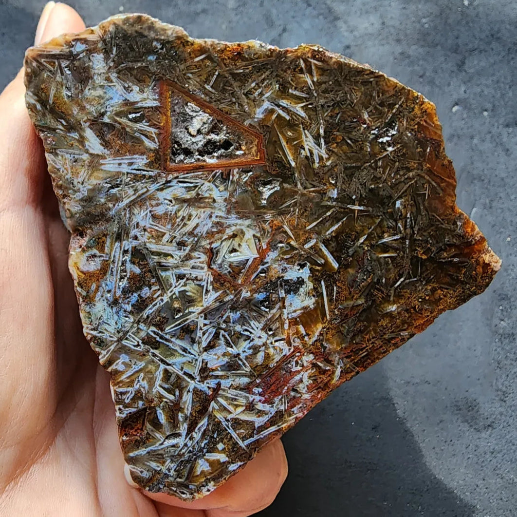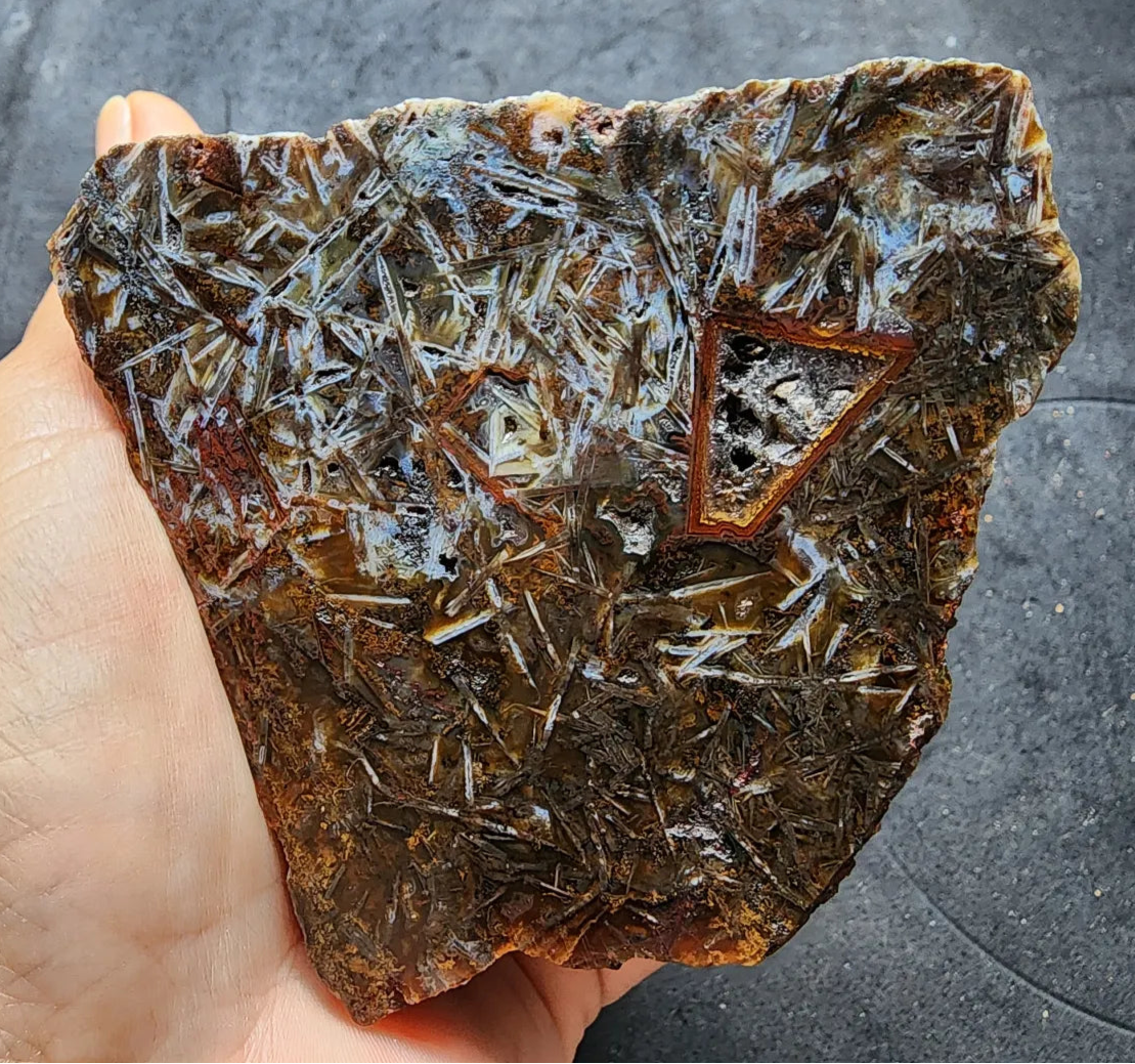 This needle agate is also a healing stone -- it's perfect for chakra balancing, manifestation, and divination if you are spiritually-inclined and interested in metaphysical rocks, meditation stones, and spiritual gifts. It's an ideal agate gift, geologist gift or rock hound gift and will display very handsomely as an agate decor piece -- home decor, office decor, or room decor. It can be displayed as an interior design element in any space.