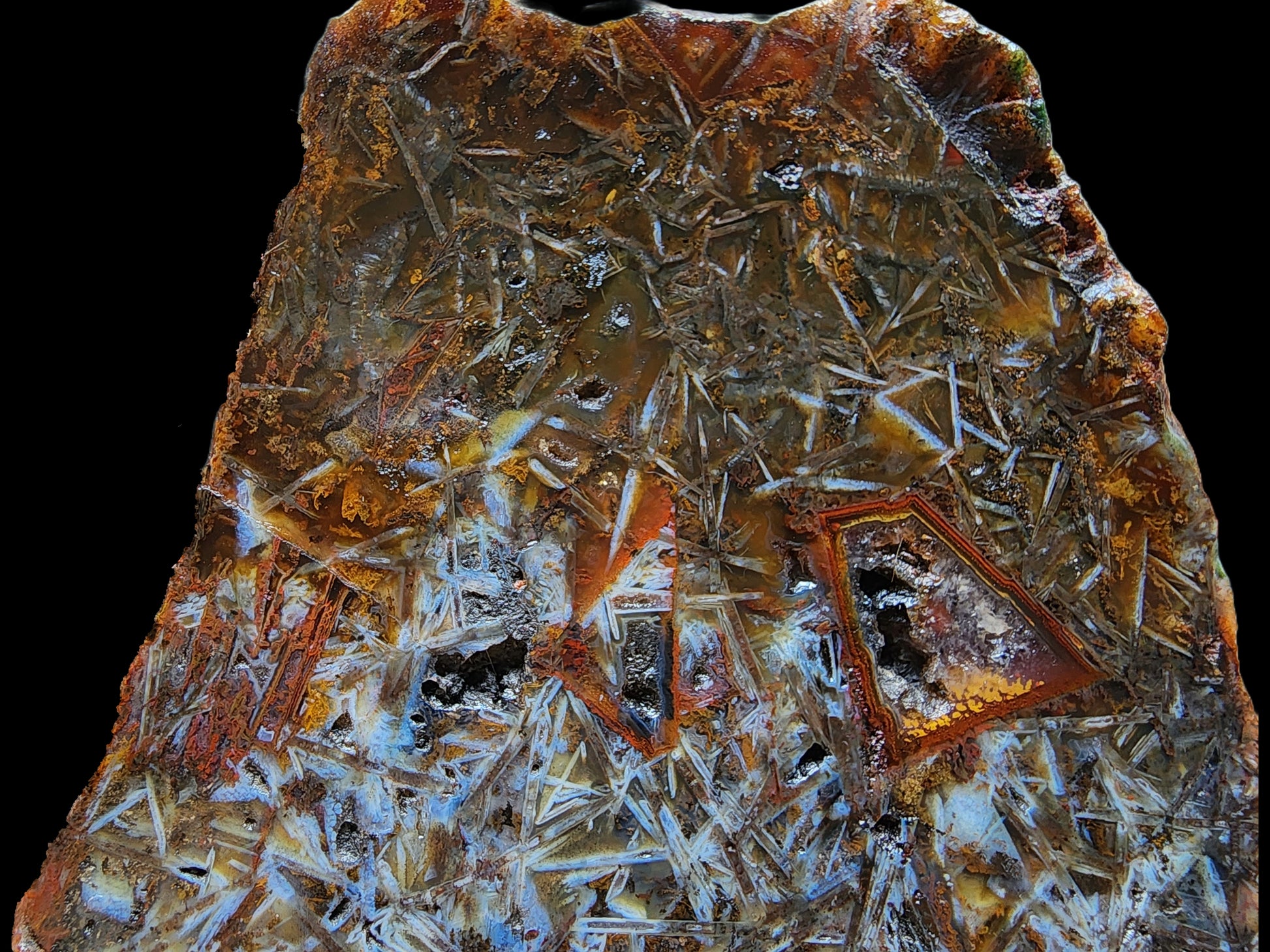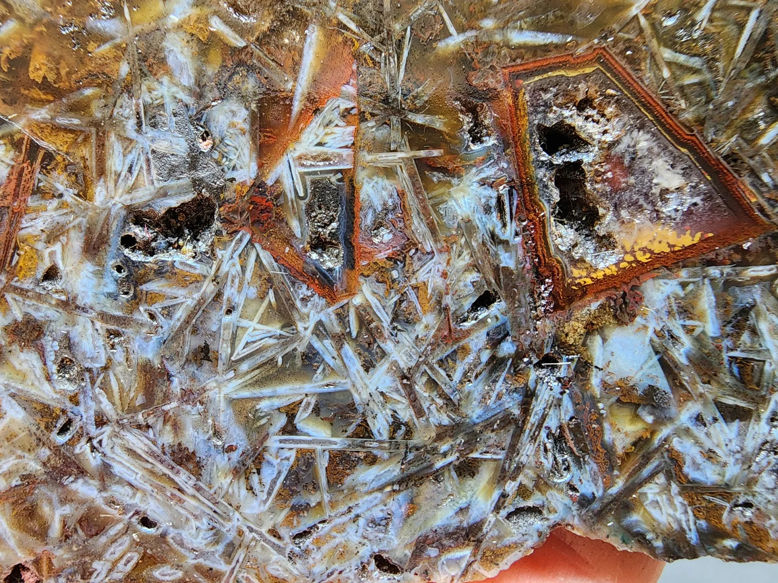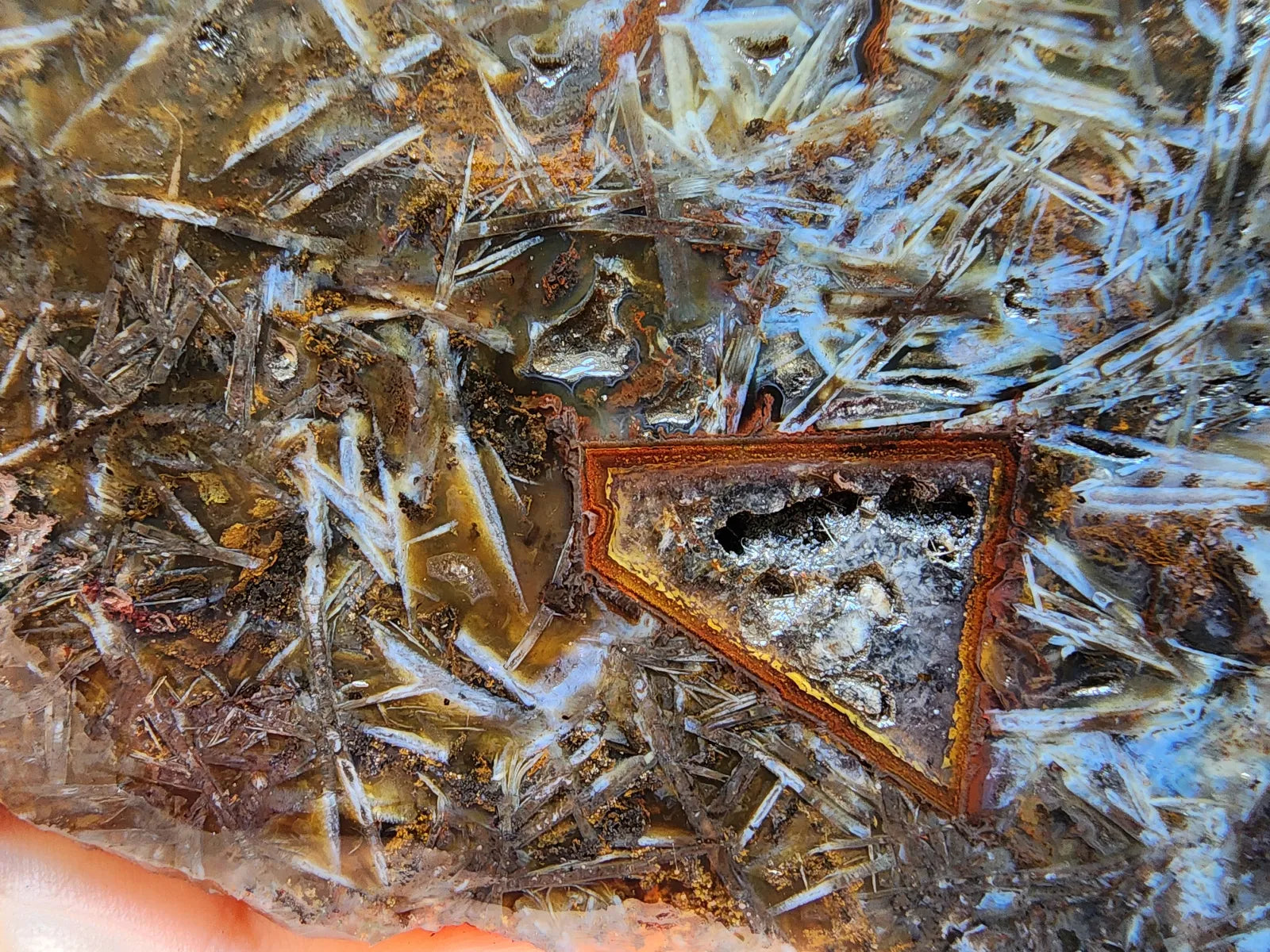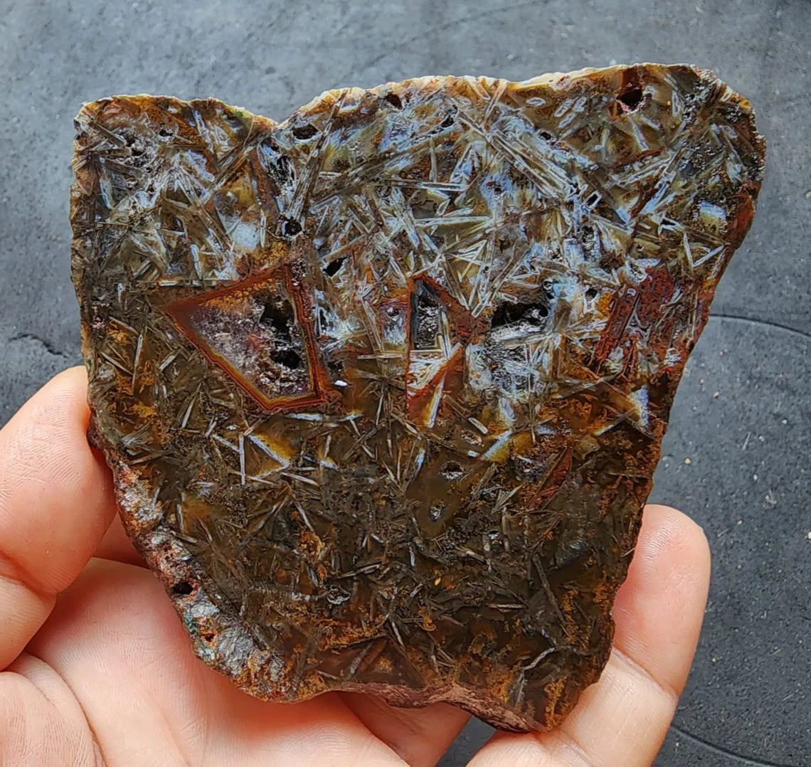 This needle agate is also a healing stone -- it's perfect for chakra balancing, manifestation, and divination if you are spiritually-inclined and interested in metaphysical rocks, meditation stones, and spiritual gifts. It's an ideal agate gift, geologist gift or rock hound gift and will display very handsomely as an agate decor piece -- home decor, office decor, or room decor. It can be displayed as an interior design element in any space.
