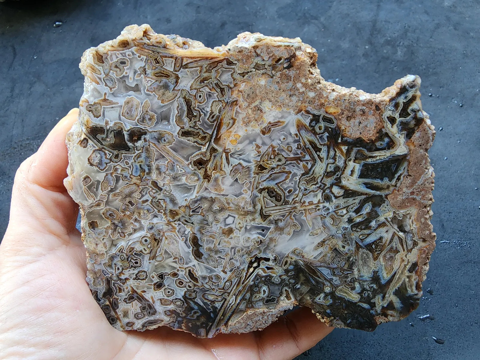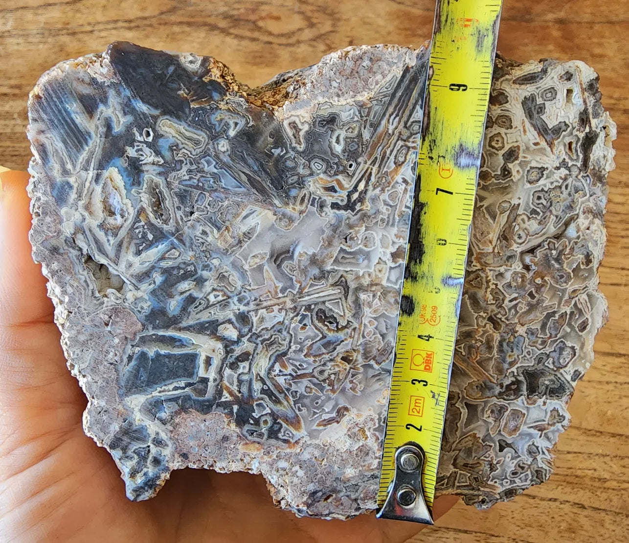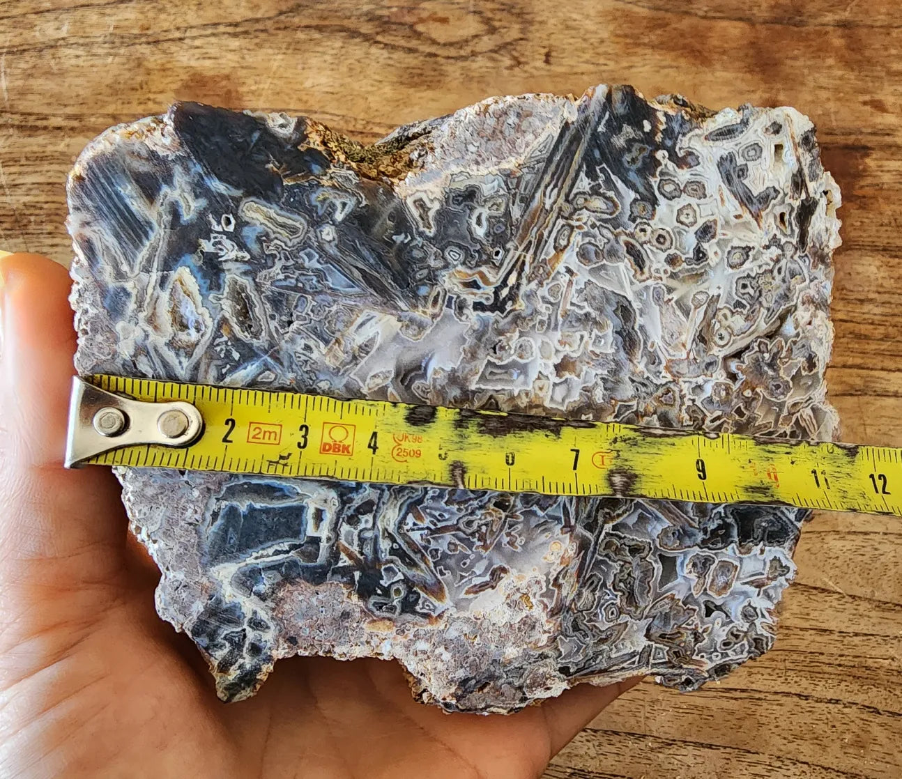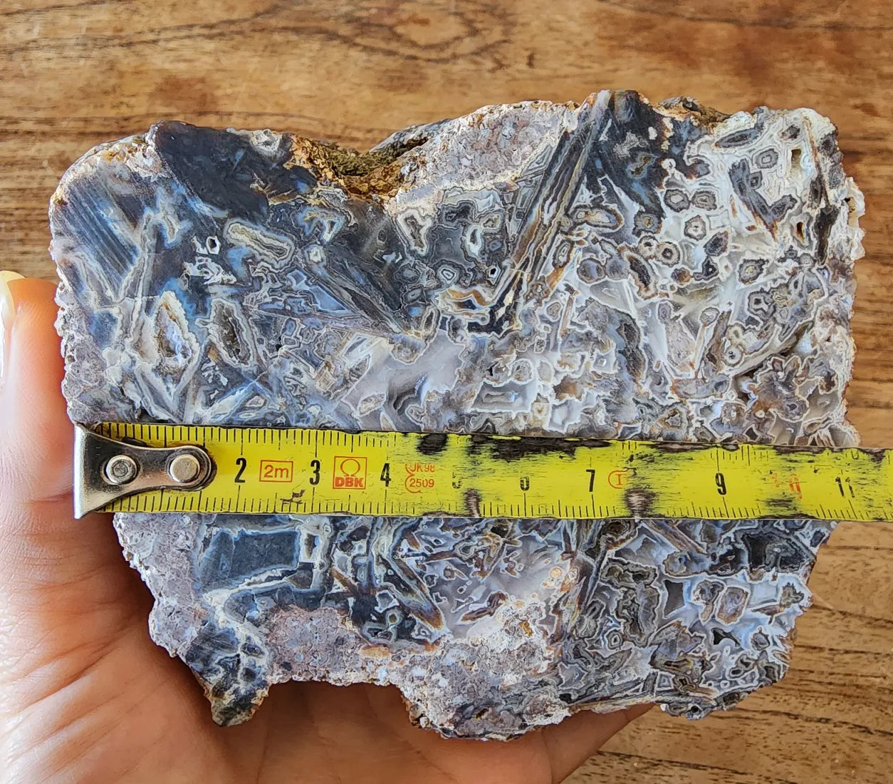 This listing is for an unpolished, undyed, 100% natural pseudomorph agate slab from Turkey weighing a total of 34.03 oz (965 gr). The first 12 pictures and video were taken outdoors with the agate rough wet (not under direct sunlight); the rest, indoors and dry. We did not apply any filters to the photos or video, before or after taking them. It will grace any rock collection, grace any area. It will provide wonderful cabs, slabs, and jewelry if you are looking for rocks for jewelry. The photos and video speak volumes.