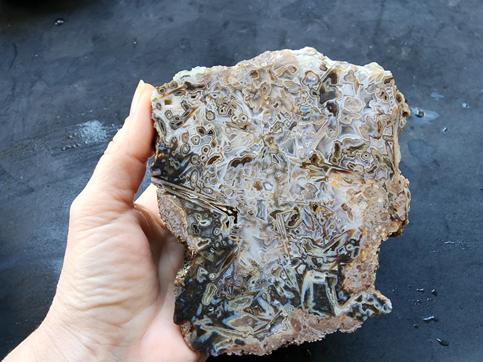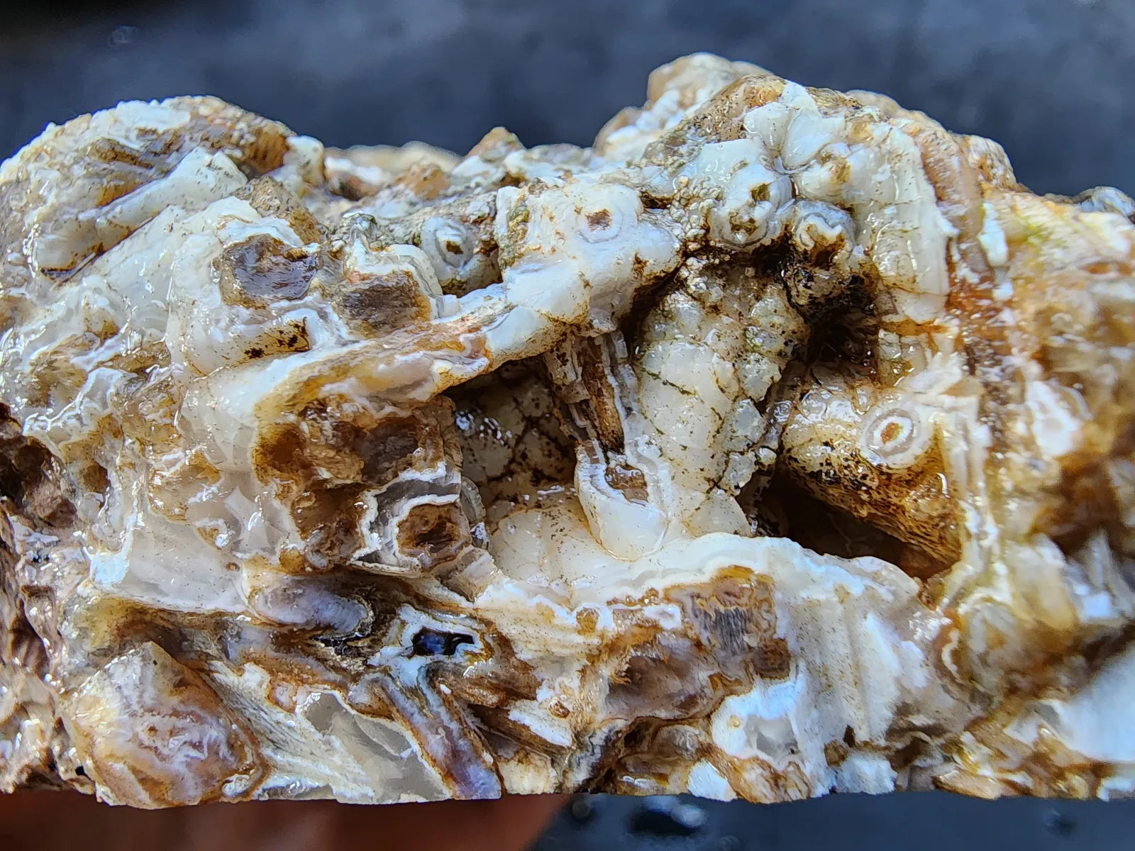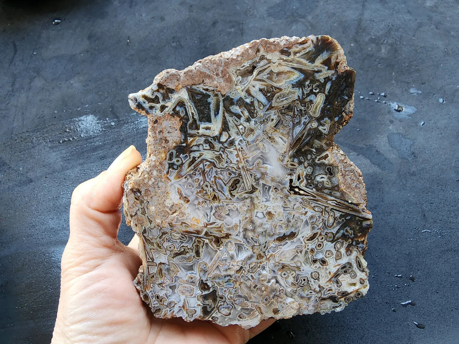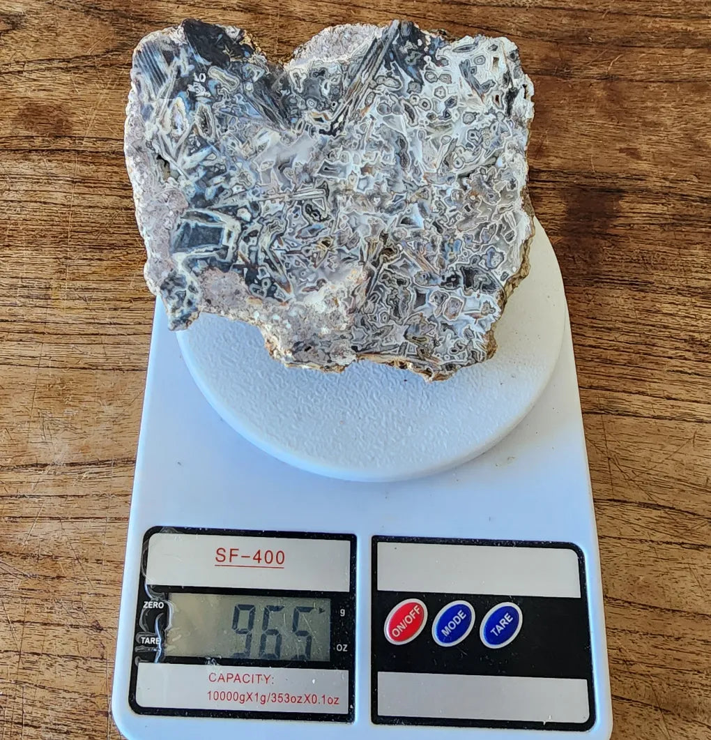 This listing is for an unpolished, undyed, 100% natural pseudomorph agate slab from Turkey weighing a total of 34.03 oz (965 gr). The first 12 pictures and video were taken outdoors with the agate rough wet (not under direct sunlight); the rest, indoors and dry. We did not apply any filters to the photos or video, before or after taking them. It will grace any rock collection, grace any area. It will provide wonderful cabs, slabs, and jewelry if you are looking for rocks for jewelry. The photos and video speak volumes.