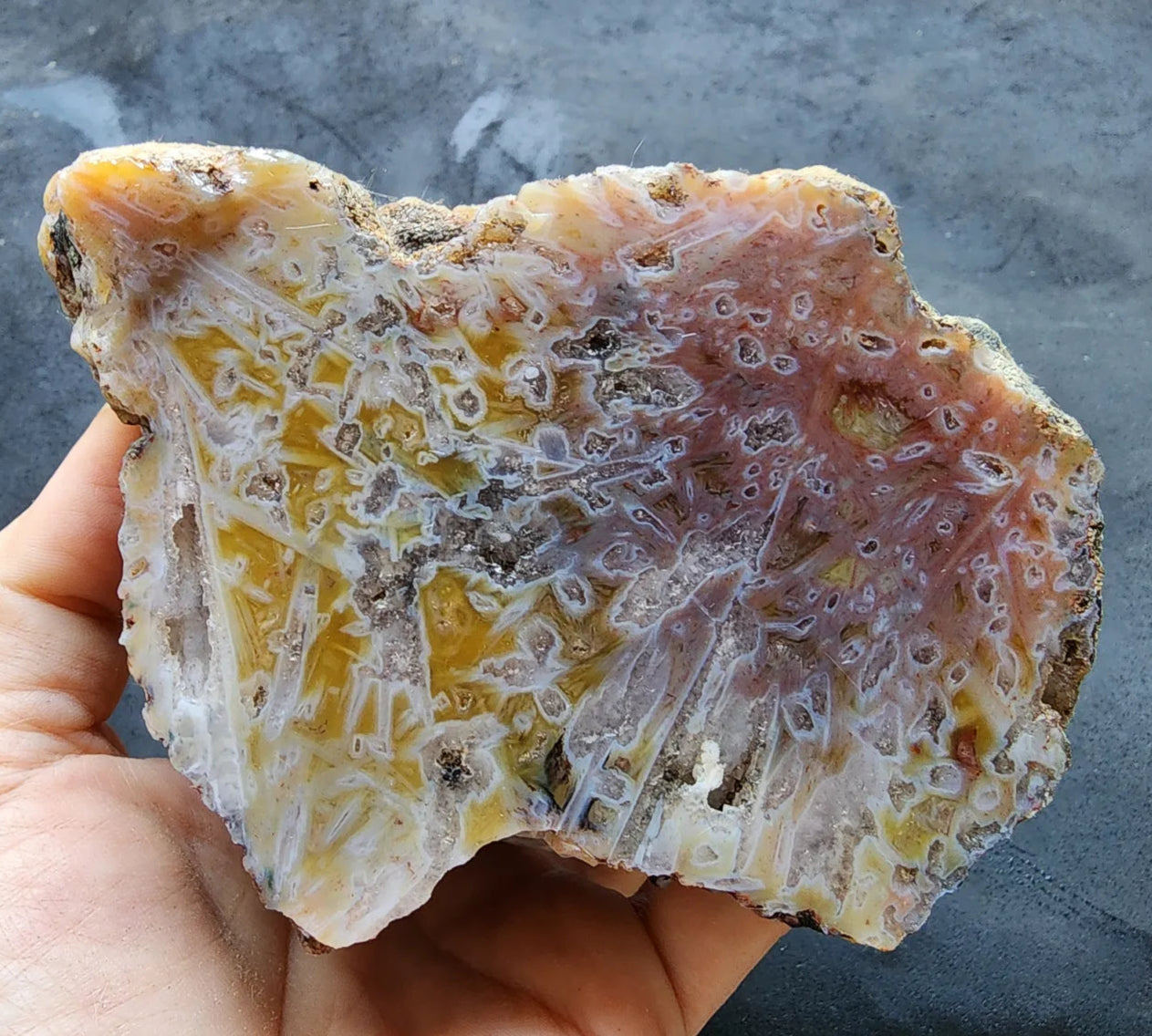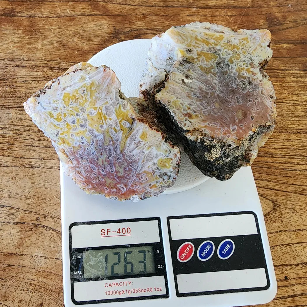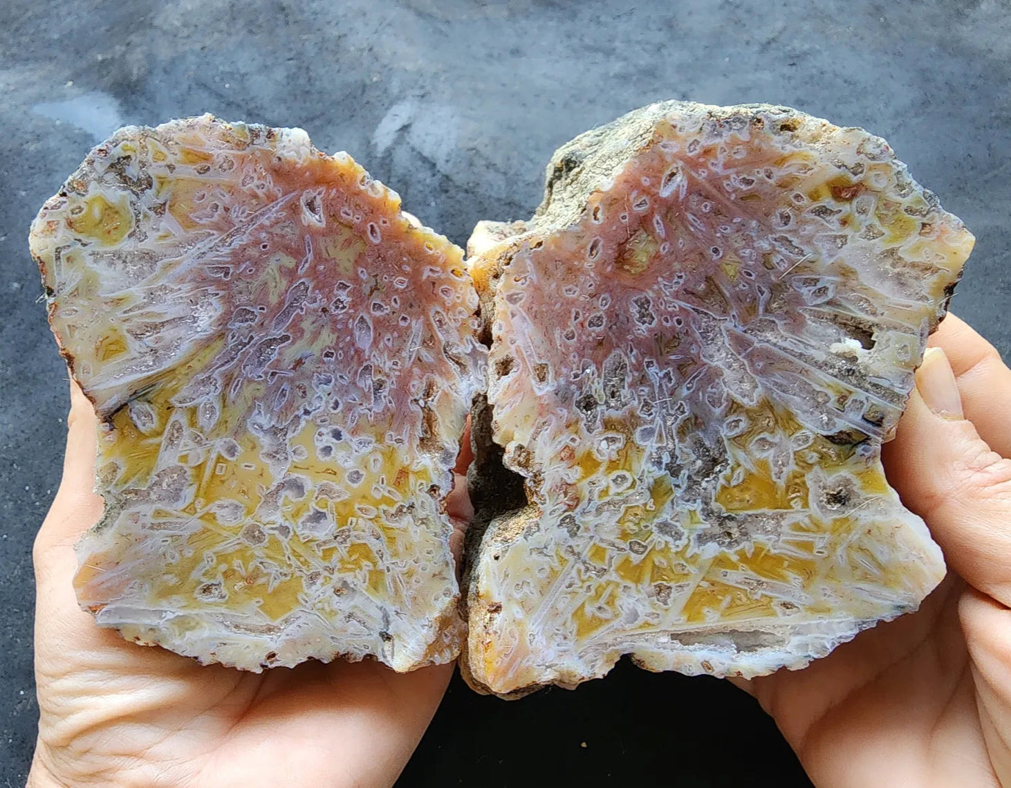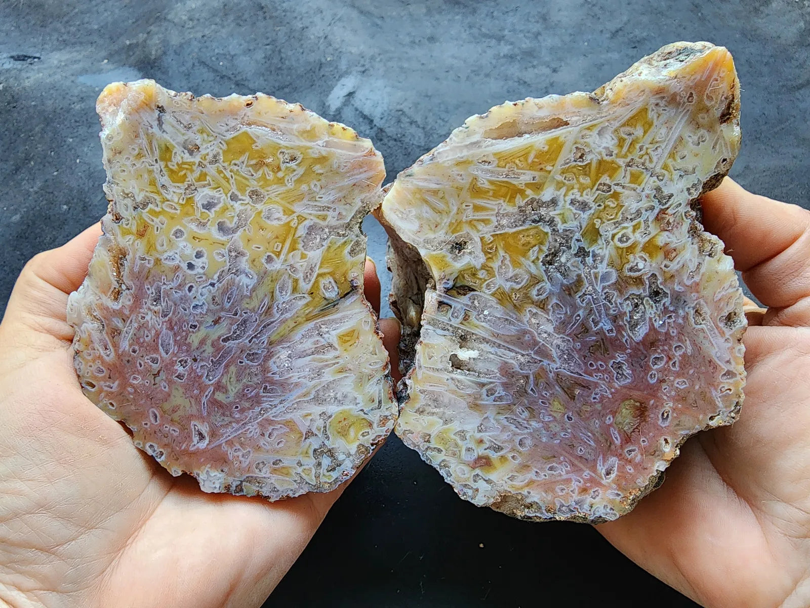 This listing is for an unpolished, undyed, 100% natural pink agate / yellow agate pair from Turkey weighing a total of 2.7 lbs (1.26 kg). The first 12 pictures and video were taken outdoors with the multi color agate pair wet (not under direct sunlight); the rest, indoors and dry. We did not apply any filters to the photos or video, before or after taking them. They will grace any rock collection.